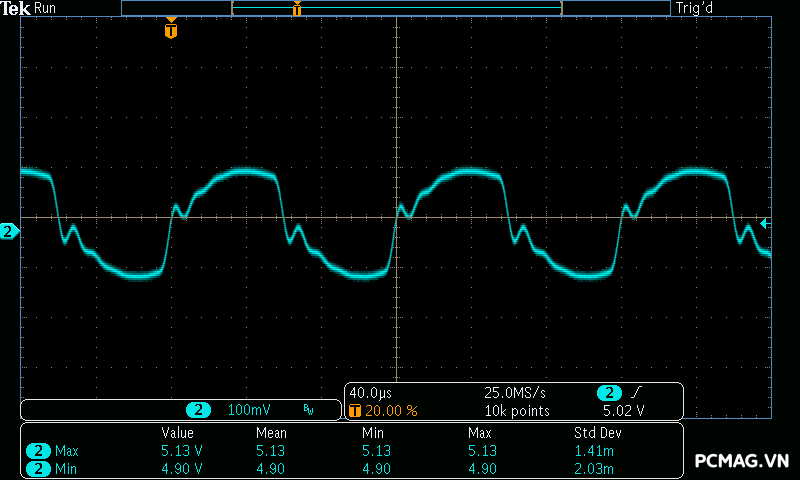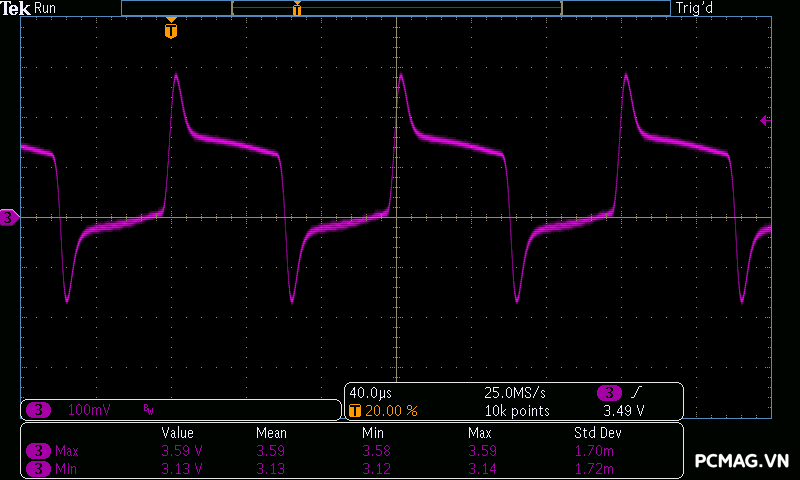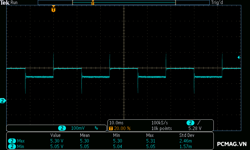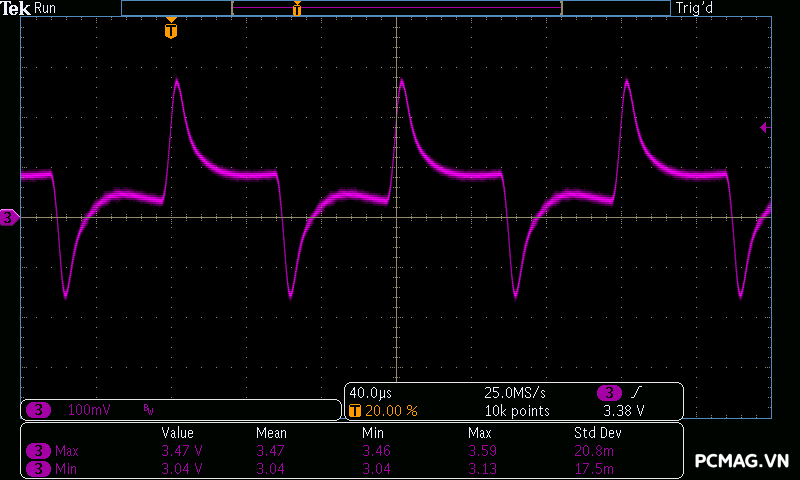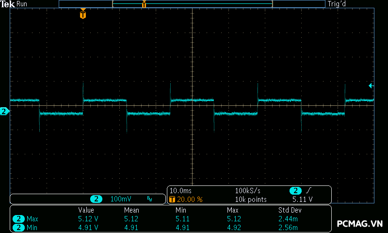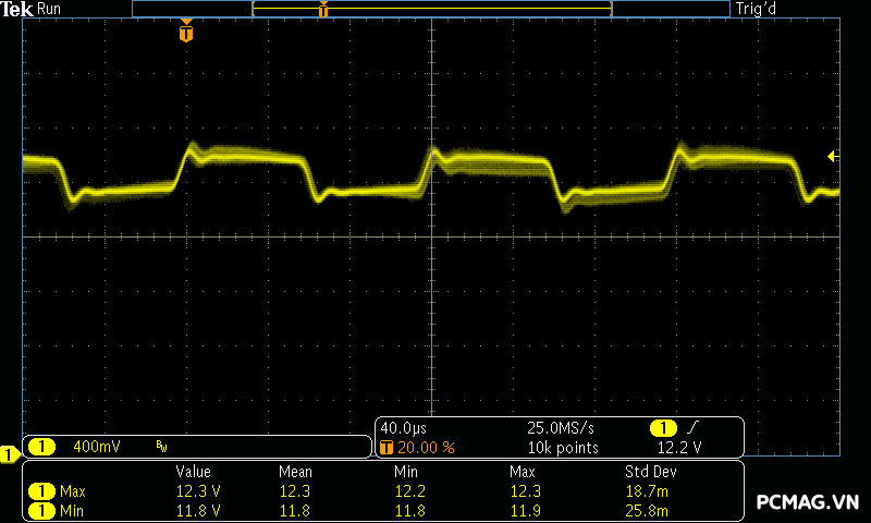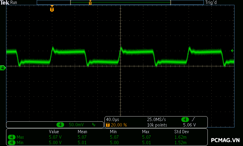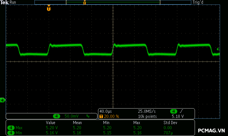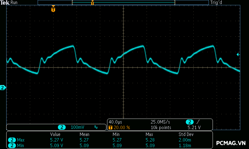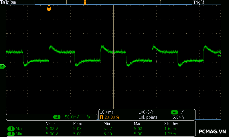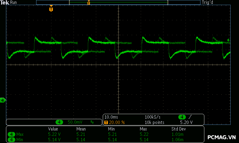 Trong bài kiểm tra tải biến thiên, VSP Extreme TPS650 650W cho kết quả tương tự nhiều bộ nguồn ở phân khúc phổ thông. Hai đường +5V và +3.3V gặp khó khăn khi chịu tải biến thiên nhanh, khiến điện áp sụt xuống thấp hơn giới hạn an toàn của chuẩn ATX khoảng 0.1V trong một số thời điểm. Đây là điểm thường thấy trên các mẫu PSU giá rẻ khi phải xử lý sự thay đổi tải đột ngột.