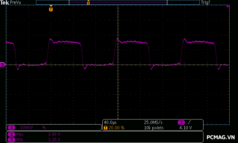 Bài kiểm tra được thực hiện với mức capacitance load 3300µF cho mỗi rail (12V1, 12V2, 5V, 3.3V và 5Vsb). Tốc độ thay đổi dòng (slew rate) theo chuẩn Intel ATX 3.0 gồm: