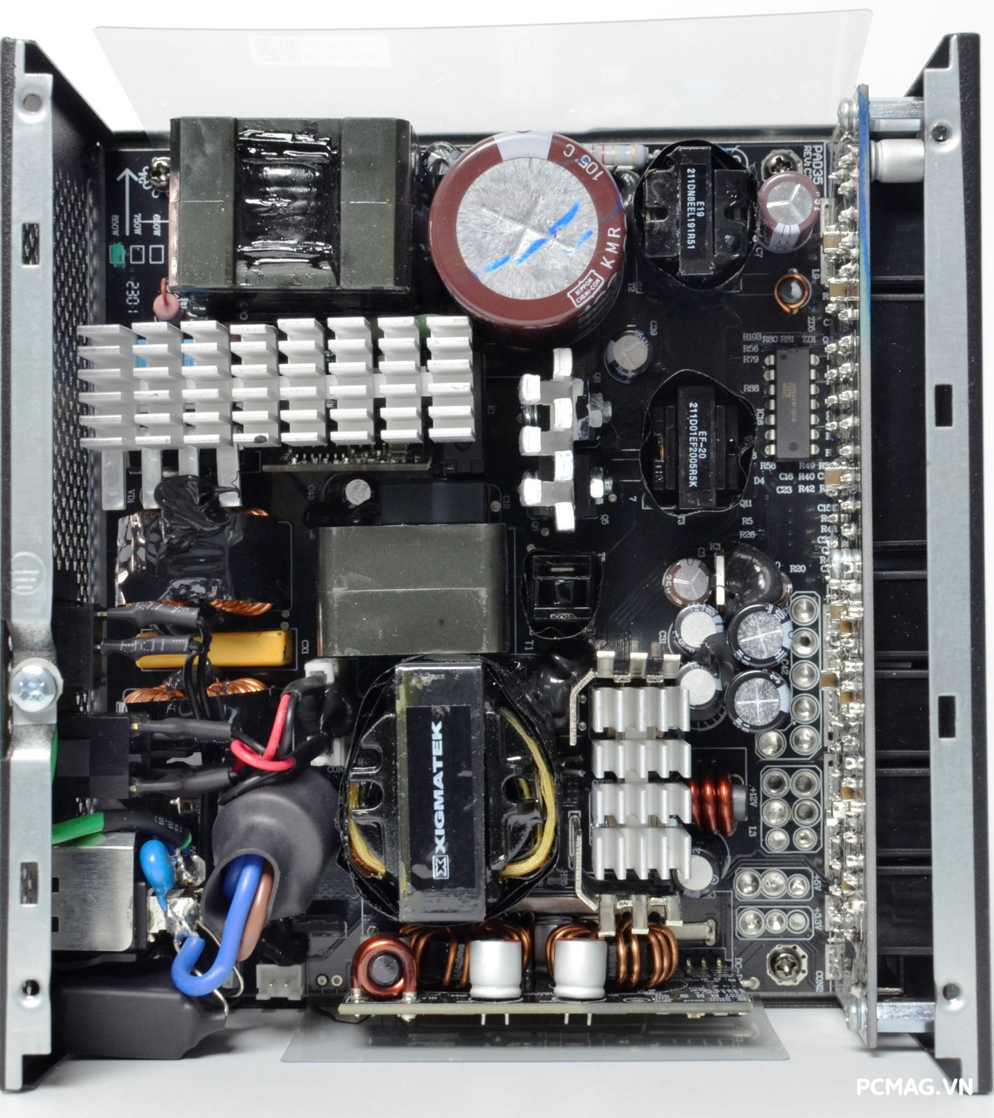 Về thiết kế mạch, PSU sử dụng cấu trúc hiện đại gồm Active PFC kết hợp mạch cộng hưởng LLC cầu H (Full-Bridge), chỉnh lưu đồng bộ ở ngõ ra, cùng hệ thống DC-to-DC/VRM cho các đường điện 5V và 3.3V, giúp tối ưu hiệu suất và đảm bảo độ ổn định điện áp trong quá trình vận hành.