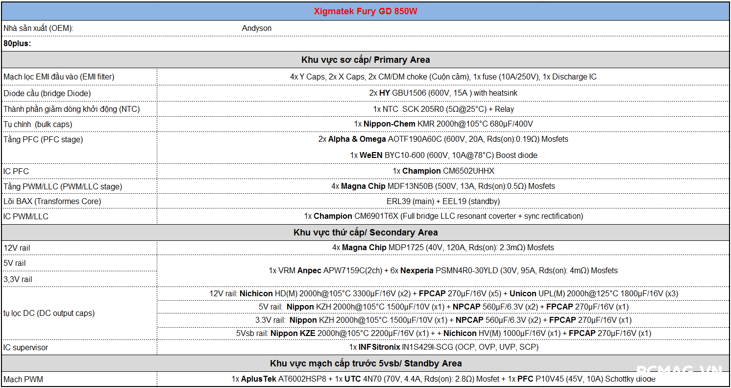 Bảng linh kiện được sử dụng trên Fury GD 850W: