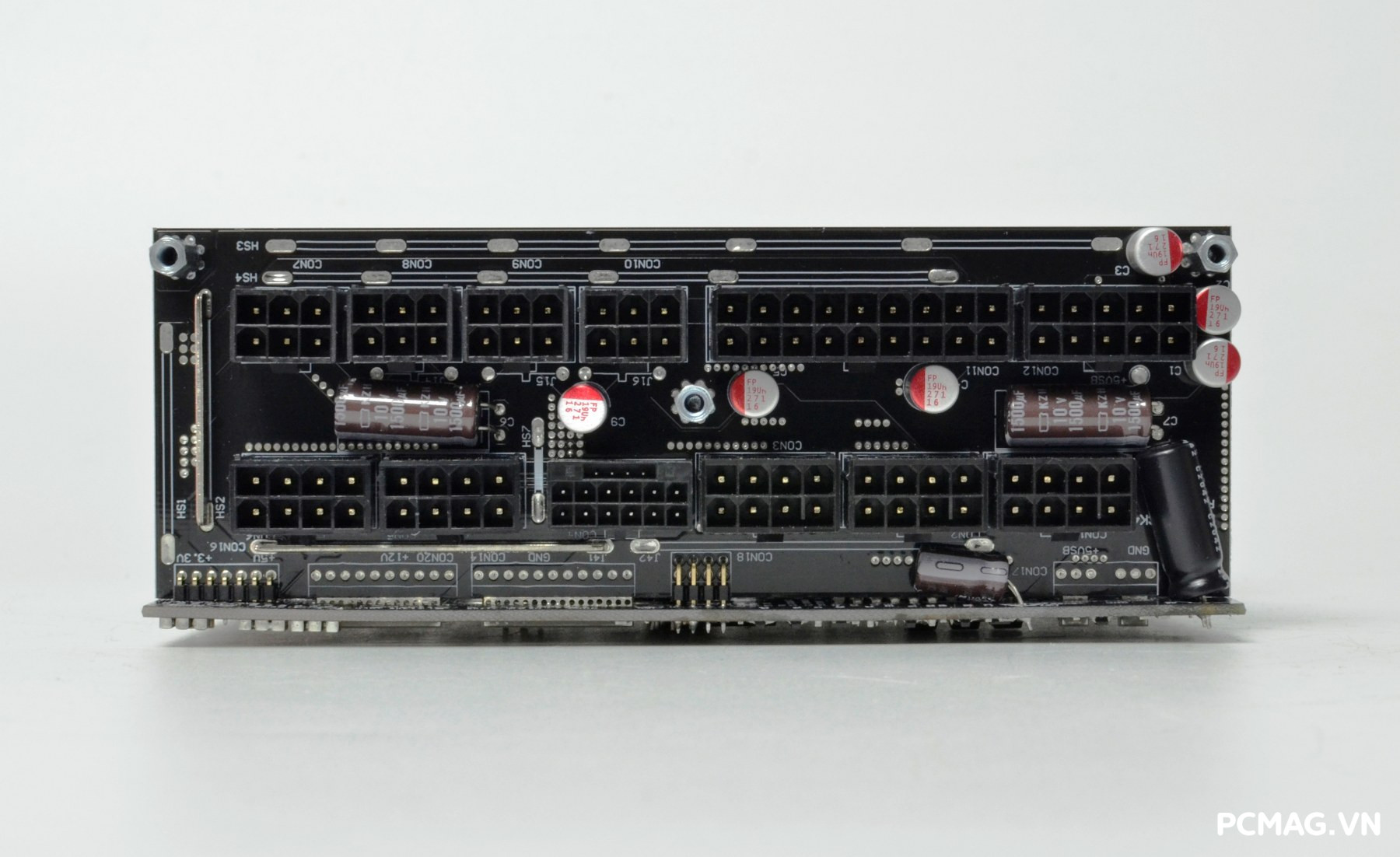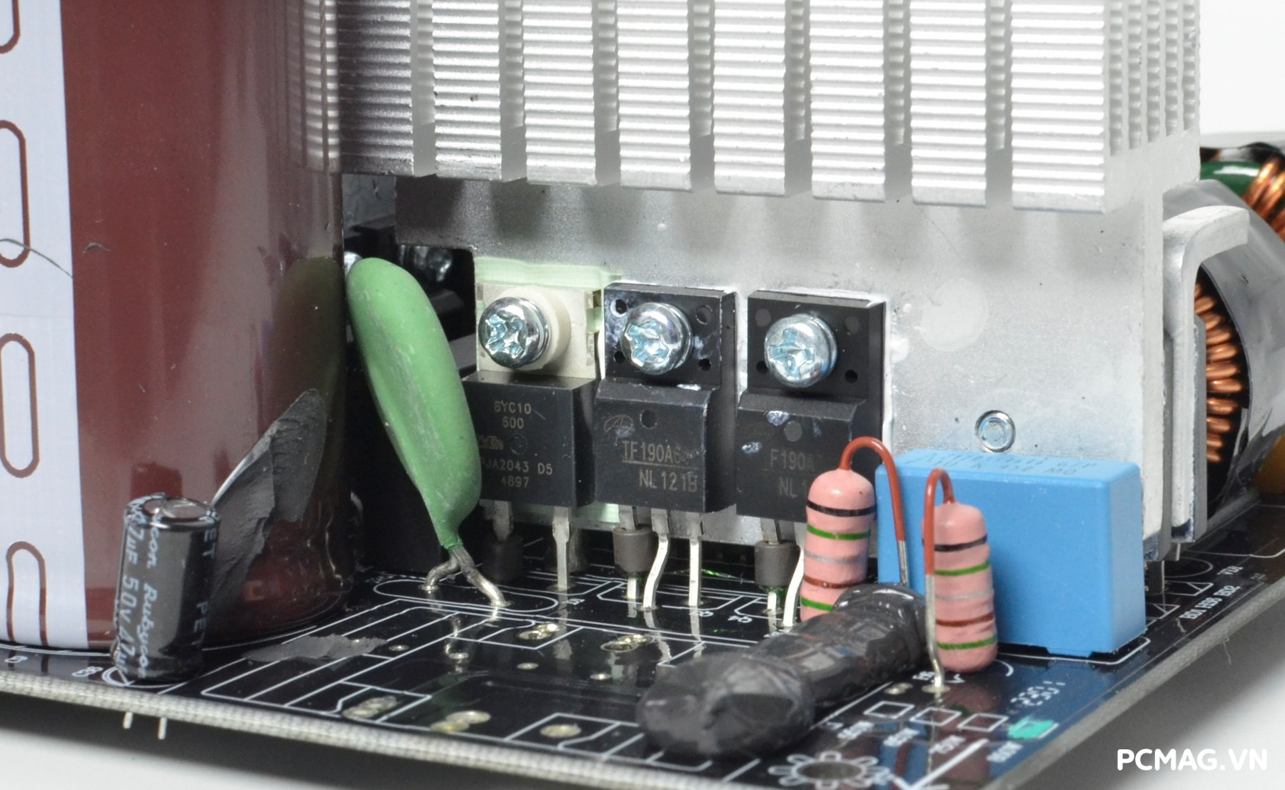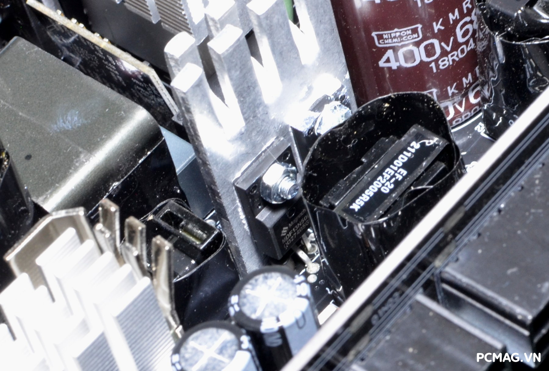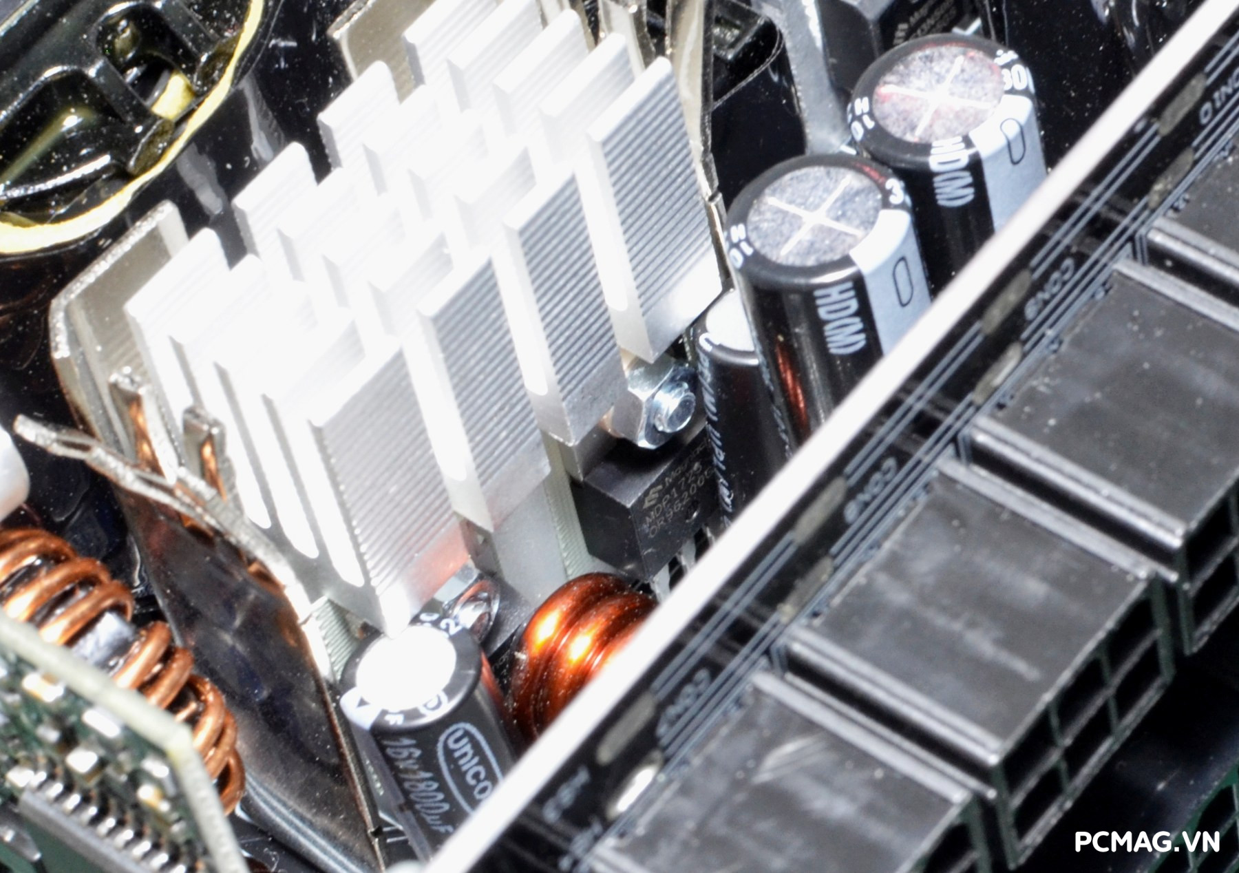 Đáng chú ý, sản phẩm sử dụng cơ chế công tắc “mềm” – thường chỉ xuất hiện trên các PSU công suất lớn trên 1200W. Với thiết kế này, công tắc chỉ đảm nhiệm việc bật/tắt nguồn cấp cho IC dao động của tầng PFC với dòng tiêu thụ rất nhỏ, thay vì ngắt trực tiếp dòng điện chính. Điều này giúp giảm hao mòn linh kiện, từ đó nâng cao độ bền và tuổi thọ cho bộ nguồn.