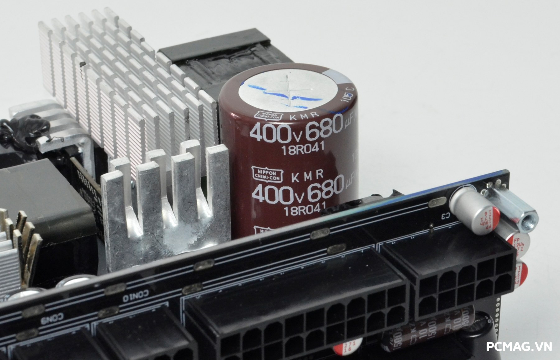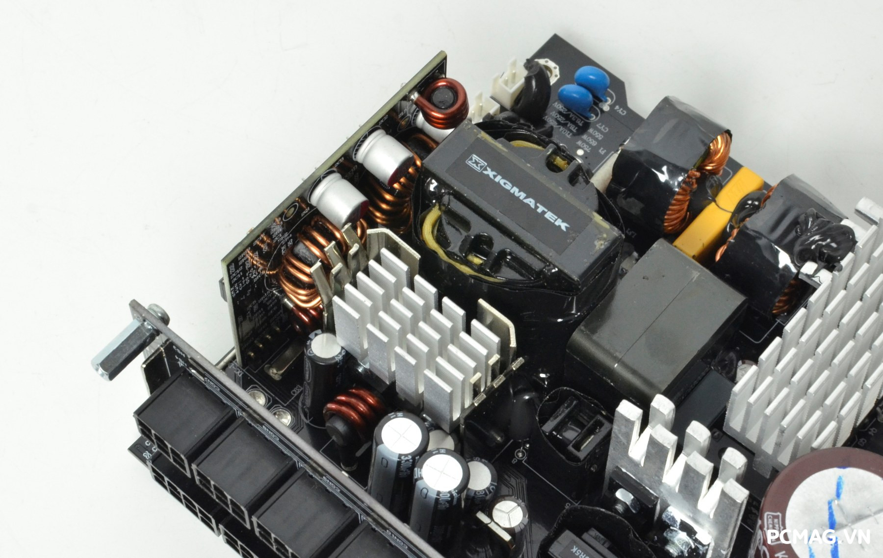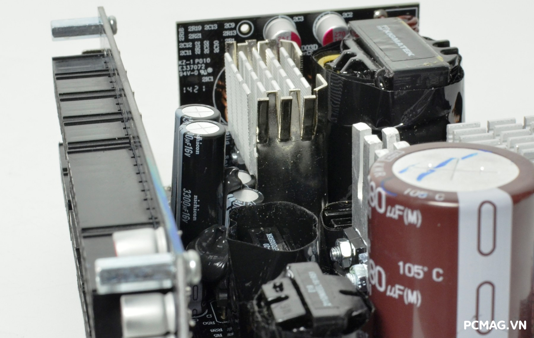 Đáng chú ý, sản phẩm sử dụng cơ chế công tắc “mềm” – thường chỉ xuất hiện trên các PSU công suất lớn trên 1200W. Với thiết kế này, công tắc chỉ đảm nhiệm việc bật/tắt nguồn cấp cho IC dao động của tầng PFC với dòng tiêu thụ rất nhỏ, thay vì ngắt trực tiếp dòng điện chính. Điều này giúp giảm hao mòn linh kiện, từ đó nâng cao độ bền và tuổi thọ cho bộ nguồn.