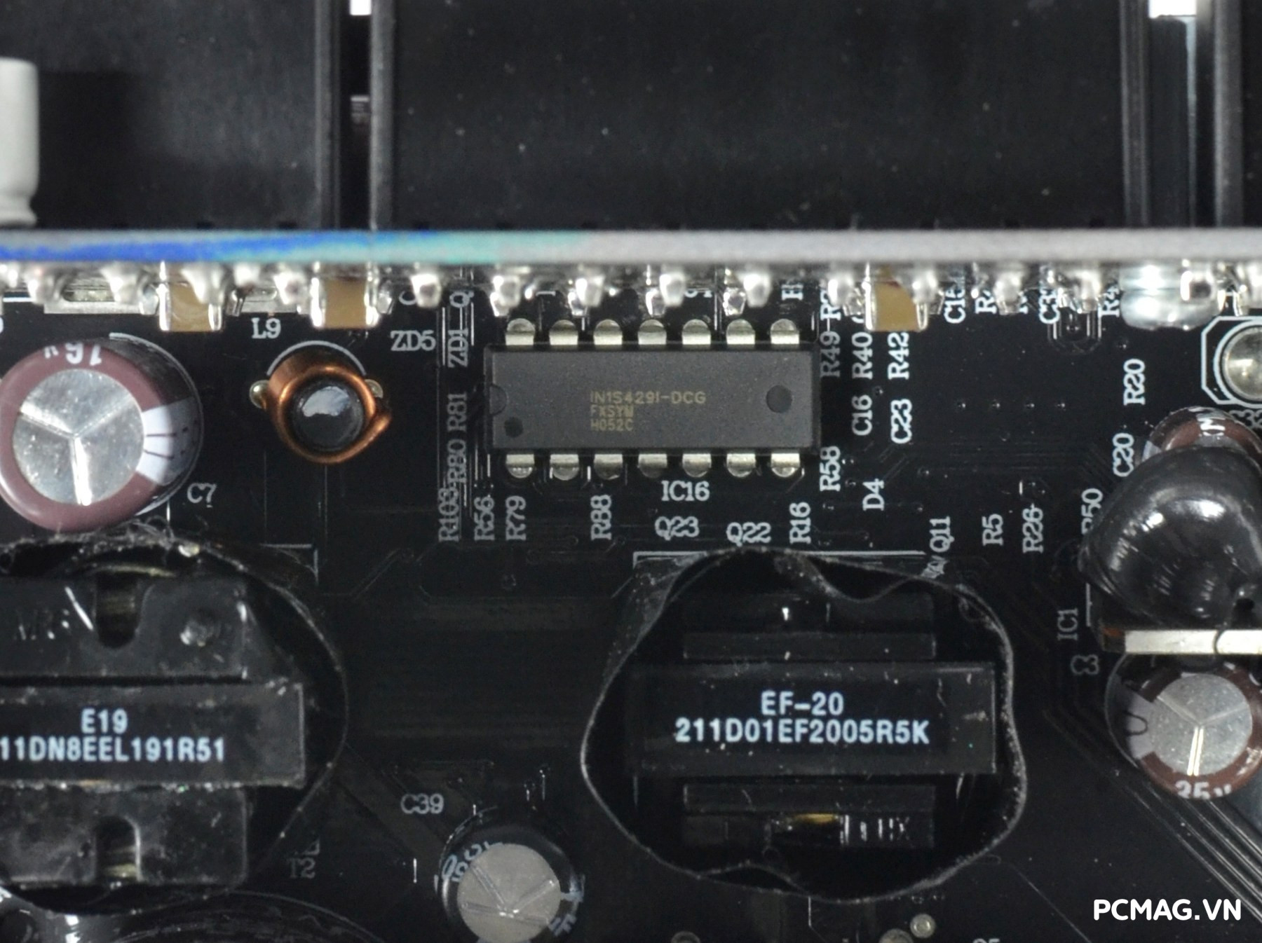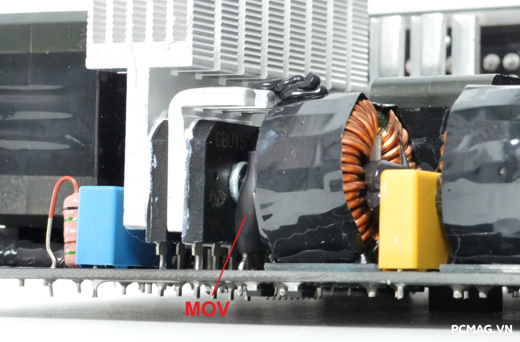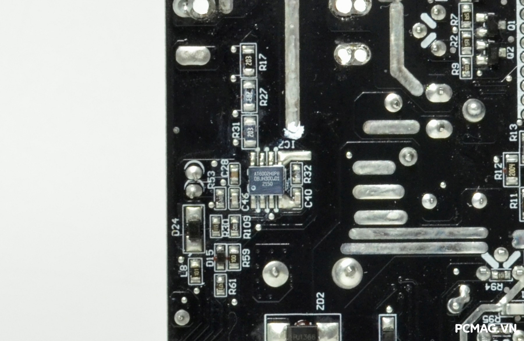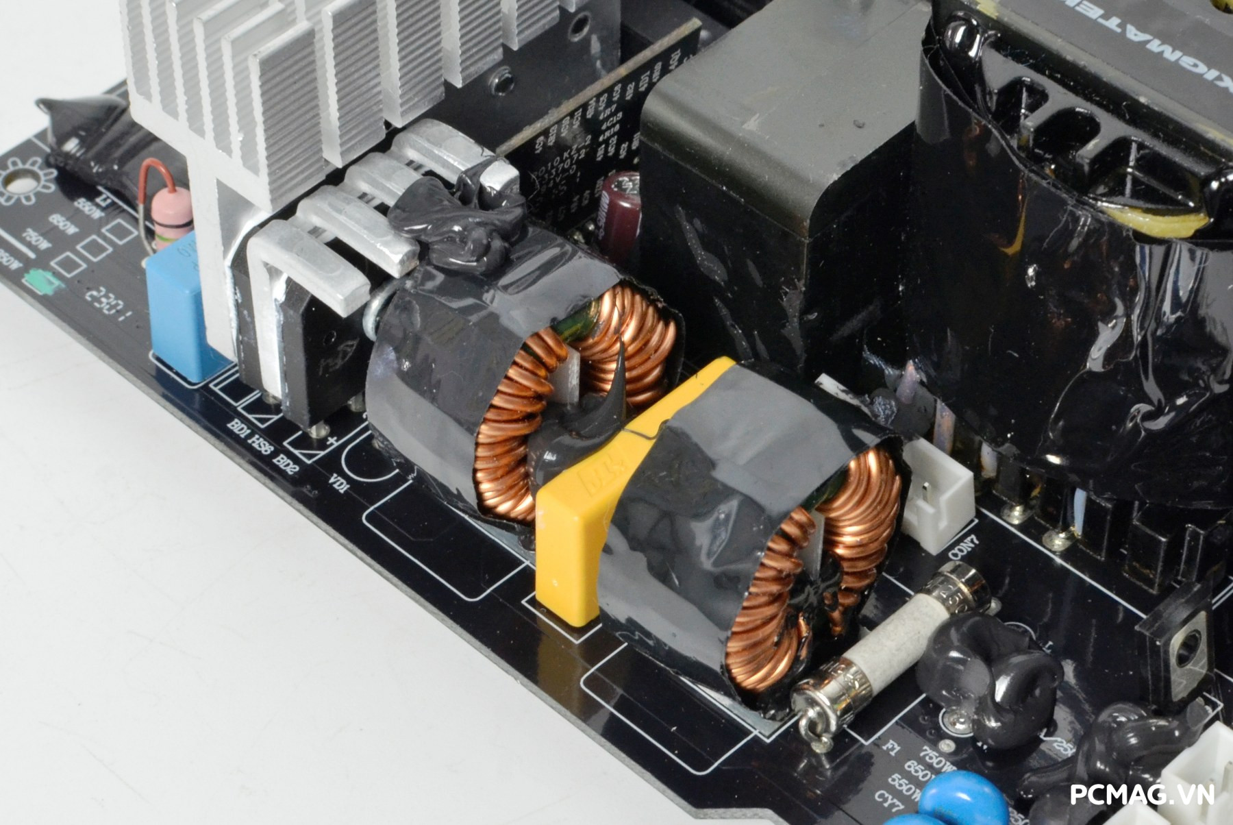 Đáng chú ý, sản phẩm sử dụng cơ chế công tắc “mềm” – thường chỉ xuất hiện trên các PSU công suất lớn trên 1200W. Với thiết kế này, công tắc chỉ đảm nhiệm việc bật/tắt nguồn cấp cho IC dao động của tầng PFC với dòng tiêu thụ rất nhỏ, thay vì ngắt trực tiếp dòng điện chính. Điều này giúp giảm hao mòn linh kiện, từ đó nâng cao độ bền và tuổi thọ cho bộ nguồn.