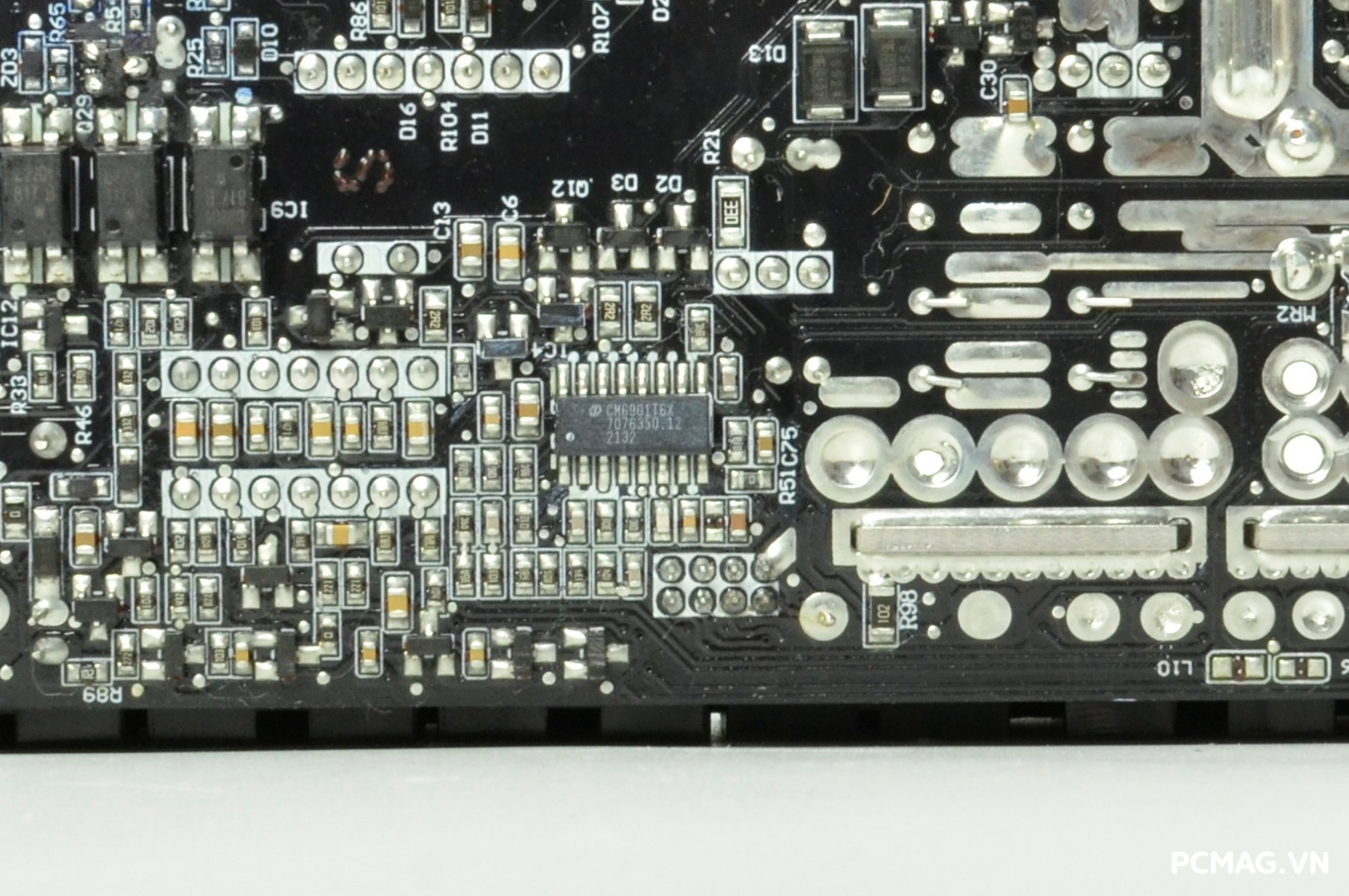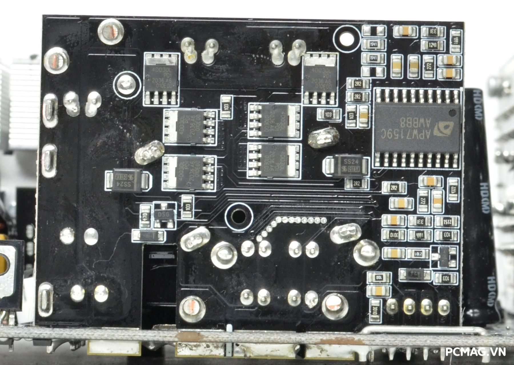 Hai đường 5V và 3.3V được tạo ra từ mạch DC-to-DC (VRM), sử dụng IC điều khiển Anpec APW7159C với 2 kênh điều khiển độc lập. Mỗi đường điện được đảm nhiệm bởi 3 MOSFET Nexperia PSMN4R0-30YLD (60A) đến từ Hà Lan, giúp đảm bảo điện áp ổn định và hiệu suất cao cho toàn hệ thống.