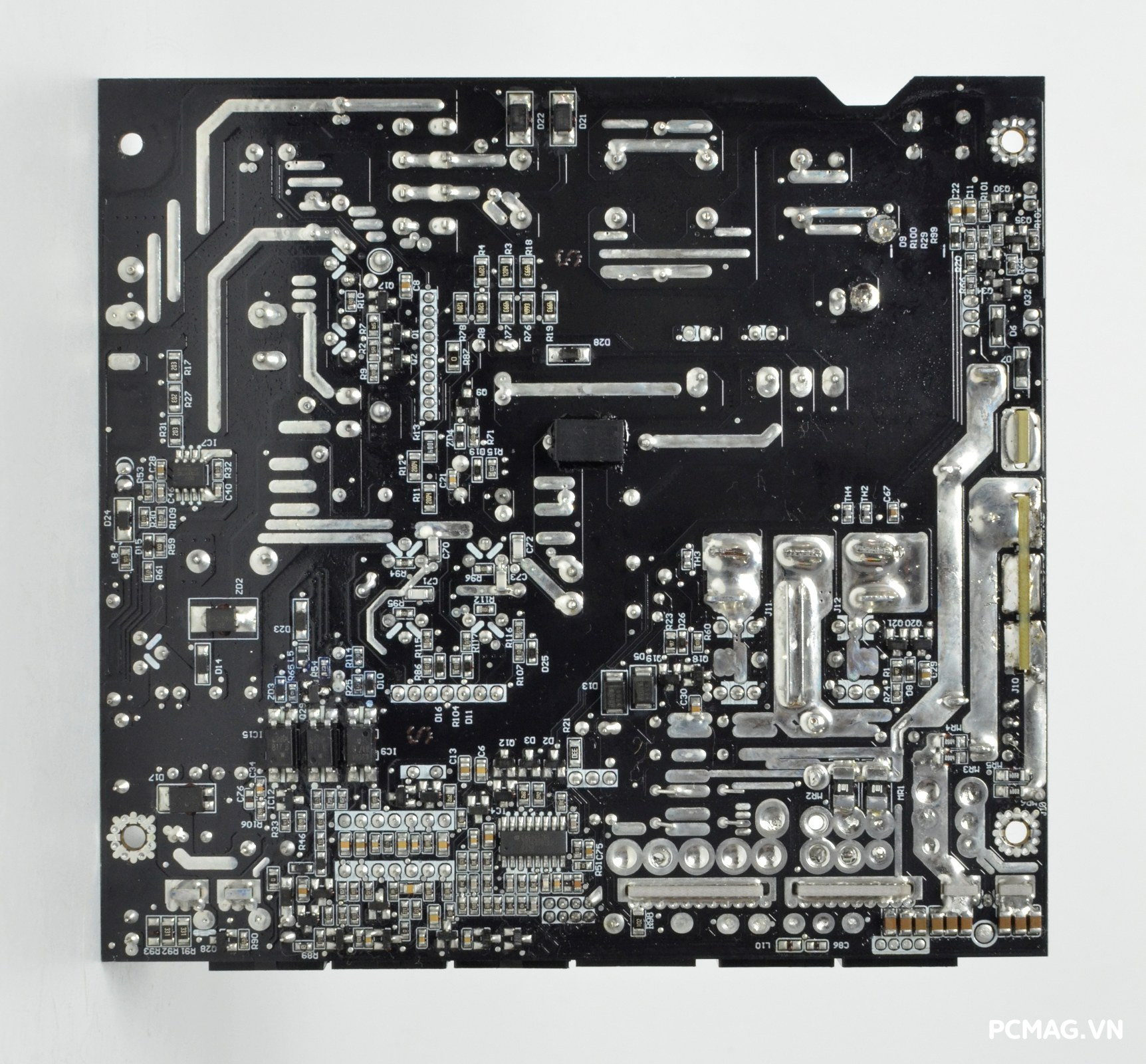 Phần PCB hoàn thiện sạch sẽ, bề mặt sáng bóng, các chân linh kiện được cắt tỉa gọn gàng. Tuy nhiên, vẫn còn xuất hiện một vài vết flux hàn chưa được xử lý triệt để, nhưng không ảnh hưởng đáng kể đến chất lượng tổng thể.