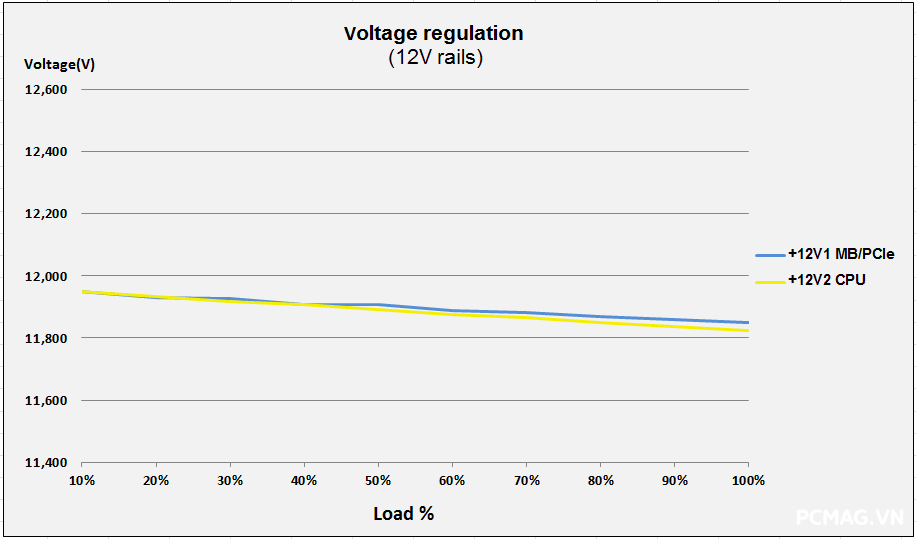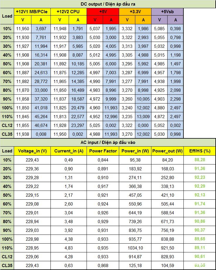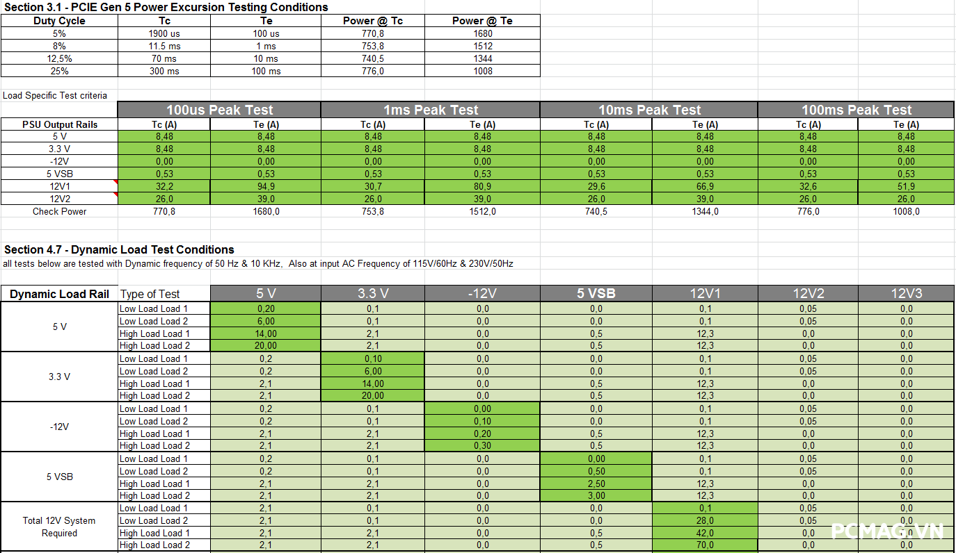 Để đơn giản hóa bảng số liệu theo Test plan ATX 3.0 của Intel, đường 12V được chia thành 2 nhánh trong quá trình thử tải đối với nguồn single rail: