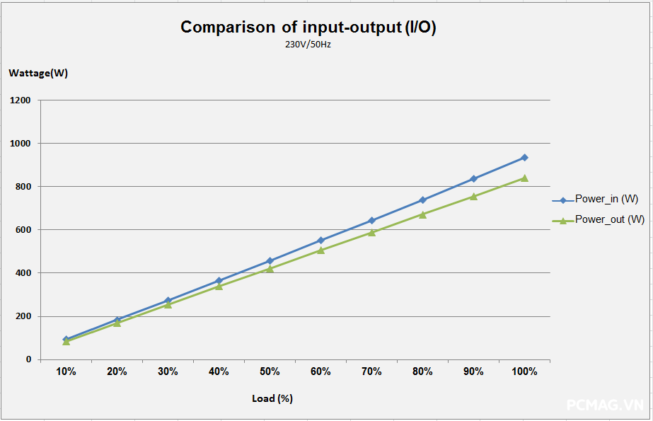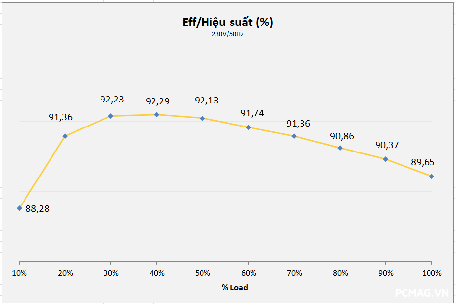 Trong các bài test, Fury GD 850W hoàn thành đầy đủ các mức tải với điện áp luôn nằm trong ngưỡng an toàn theo tiêu chuẩn ATX 3.0. Hiệu suất tối đa ghi nhận đạt 92,3% tại 230Vac, cho thấy khả năng vận hành ổn định và hiệu quả.
