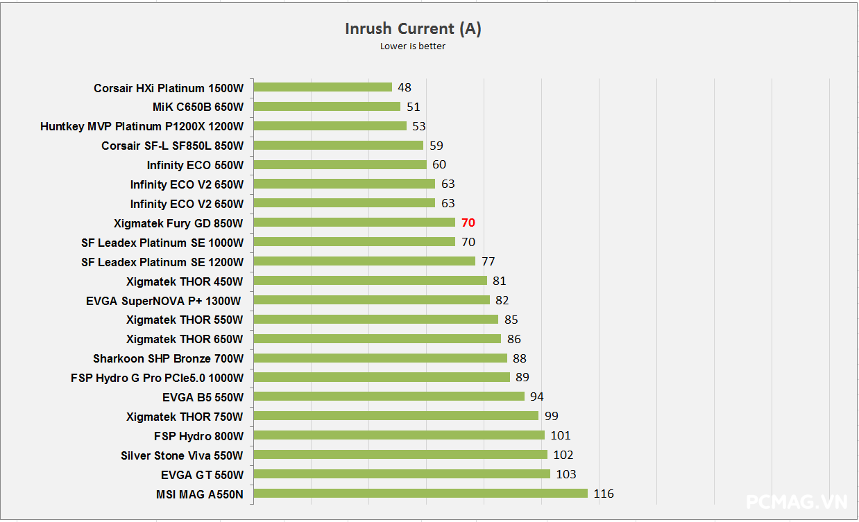 Dòng khởi động của Fury GD 850W được ghi nhận ở mức khoảng 70A, nằm trong ngưỡng trung bình đối với các bộ nguồn công suất cao, đảm bảo an toàn và không gây áp lực lớn lên hệ thống điện khi cấp nguồn ban đầu.