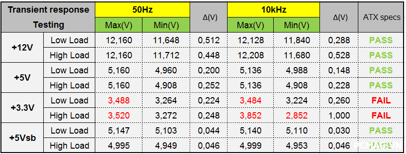 Kết quả thử nghiệm tải biến thiên được trình bày chi tiết bên dưới cho thấy Fury GD 850W kiểm soát điện áp khá tốt, với hầu hết các đường đều nằm trong ngưỡng ổn định. Riêng đường 3.3V vẫn là điểm hạn chế khi mức dao động lớn hơn so với các rail còn lại – đây vốn là điểm khó chung của nhiều PSU chuẩn ATX do dung sai rất hẹp (±0.165V).