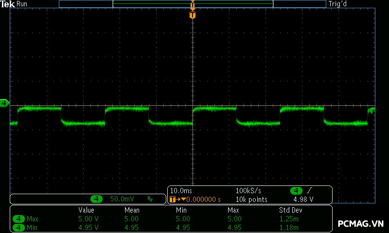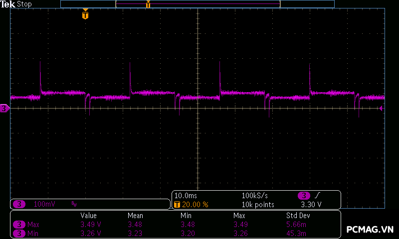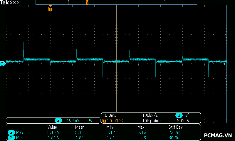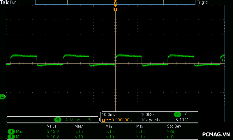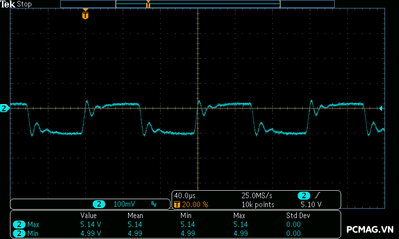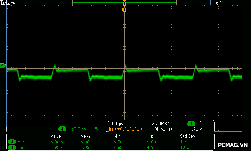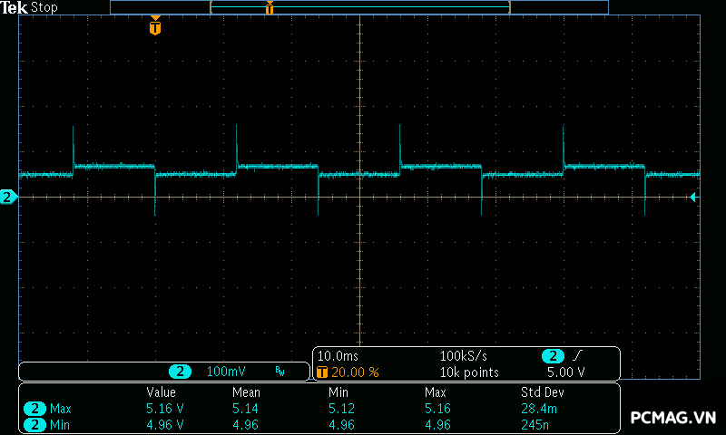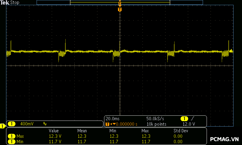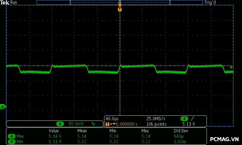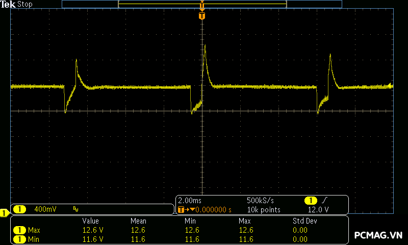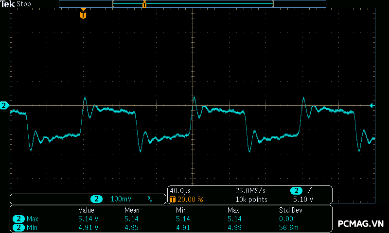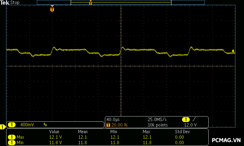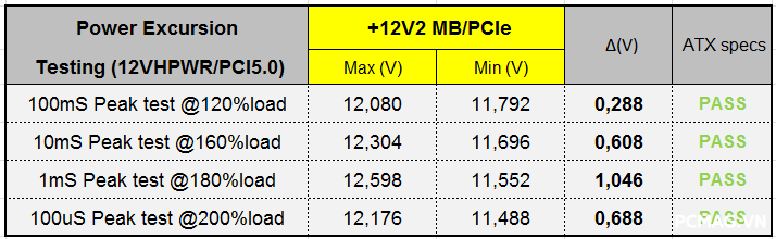 Ở bài test mô phỏng tải đột biến của GPU (power excursion), bộ nguồn đã vượt qua một cách dễ dàng, duy trì điện áp trong chuẩn ATX và hoàn toàn không xảy ra hiện tượng sập nguồn, cho thấy khả năng đáp ứng tốt với các GPU thế hệ mới.