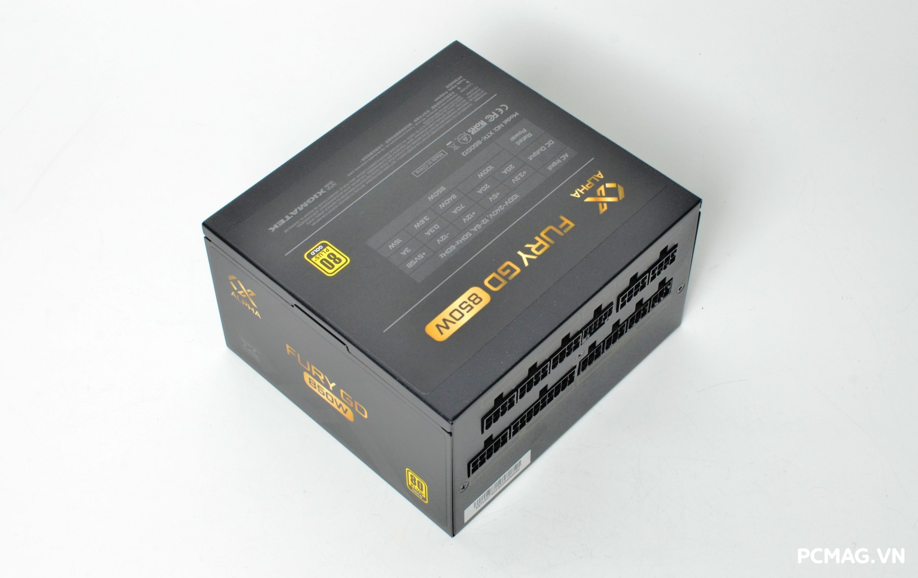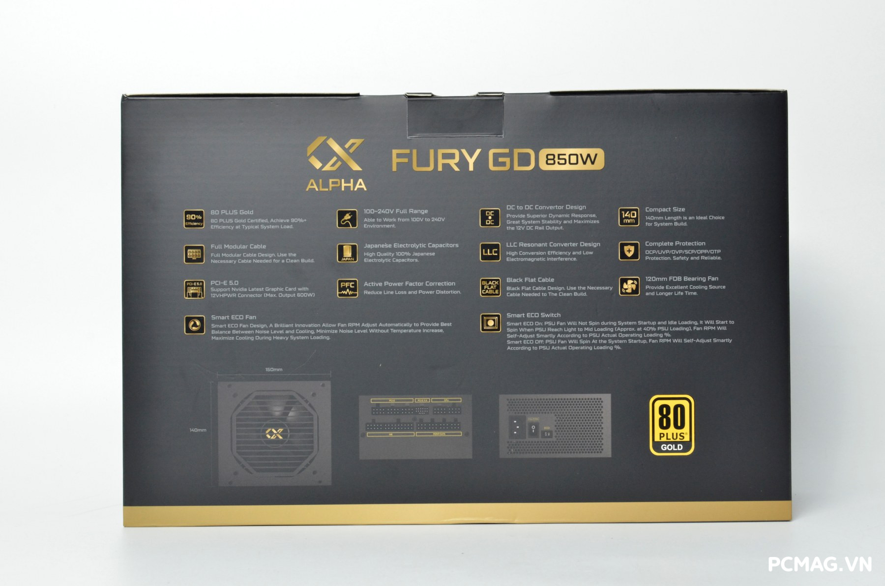 Hộp của Fury GD 850W được thiết kế khá lớn, nổi bật với tông màu vàng đồng – đen mang đậm phong cách cao cấp. Mặt sau hộp in đầy đủ các thông số kỹ thuật quan trọng, giúp người dùng dễ dàng nắm bắt cấu hình và tính năng của sản phẩm ngay từ bên ngoài.