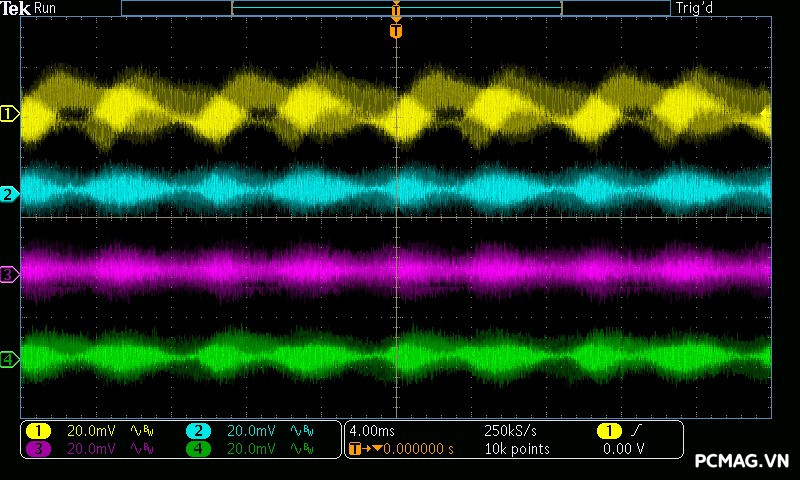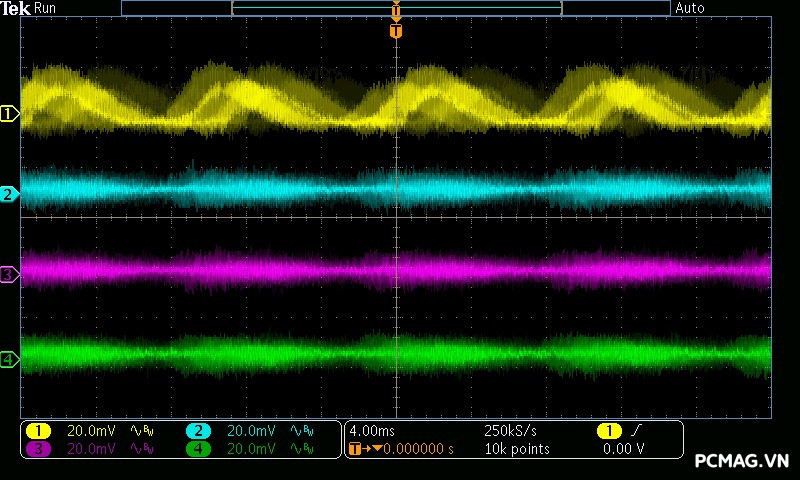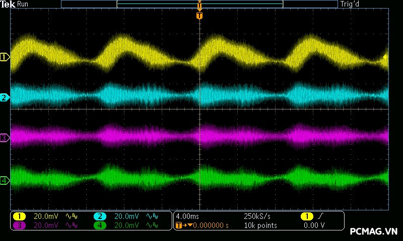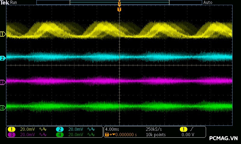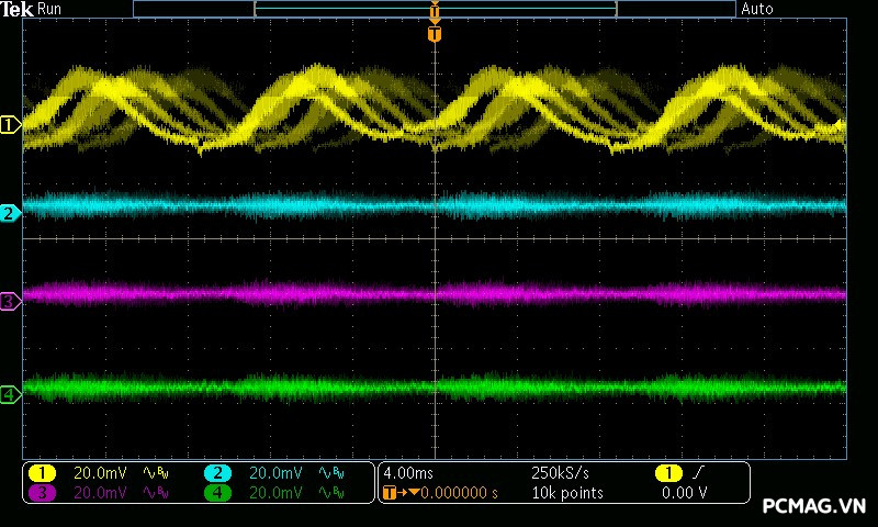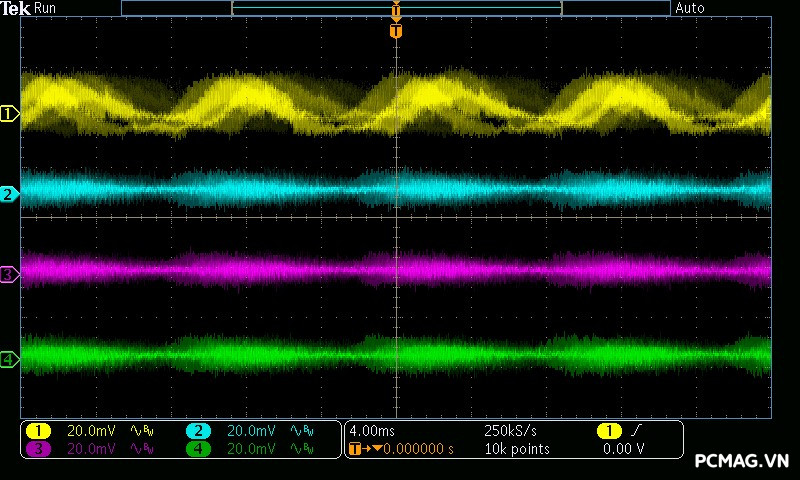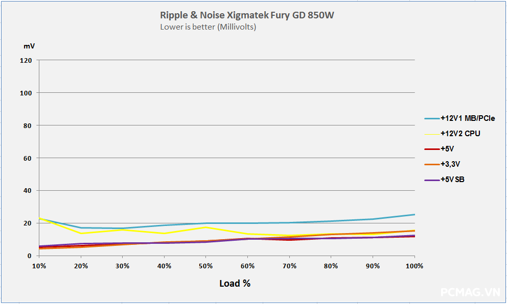 Mức nhiễu cao tần của Fury GD 850W được kiểm soát rất tốt, khi giá trị tối đa chỉ dao động khoảng ~25mV trên cả 3 đường điện chính. Đáng chú ý, PSU vẫn đạt kết quả này mà không cần sử dụng tụ lọc gắn trên dây cáp, giúp việc đi dây trong case trở nên gọn gàng và thuận tiện hơn.