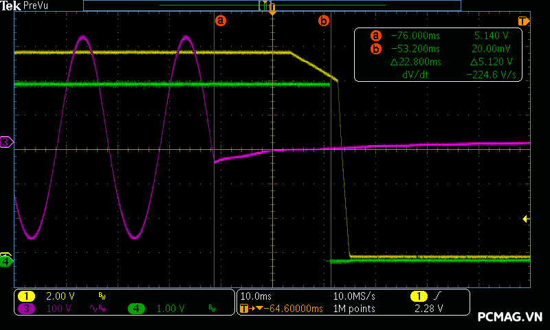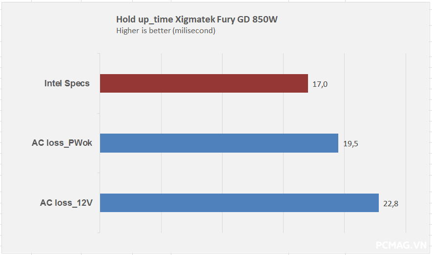 Fury GD 850W đáp ứng tốt tiêu chuẩn ATX về thời gian lưu điện. Tín hiệu PG_OK đạt khoảng 19,5ms (so với mức yêu cầu 16ms), trong khi đường 12V chỉ giảm xuống dưới ngưỡng an toàn 11.2V sau khoảng 22,8ms (so với chuẩn 17ms). Điều này cho thấy khả năng duy trì điện áp ổn định khi mất điện đột ngột khá ấn tượng.
