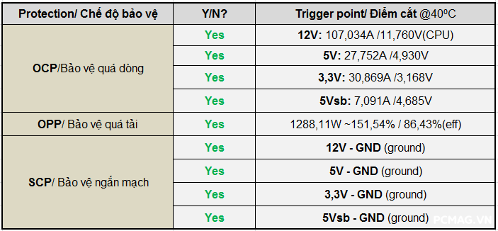 Các cơ chế bảo vệ trên Fury GD 850W hoạt động hiệu quả, đảm bảo an toàn cho hệ thống trong quá trình sử dụng. Tuy nhiên, ngưỡng kích hoạt của OPP (bảo vệ quá tải) và OCP (bảo vệ quá dòng) trên đường 12V hiện đang đặt khá cao. Nếu được điều chỉnh xuống mức khoảng 125% công suất danh định, sẽ hợp lý hơn, giúp tăng tính an toàn mà vẫn đảm bảo hiệu năng vận hành.