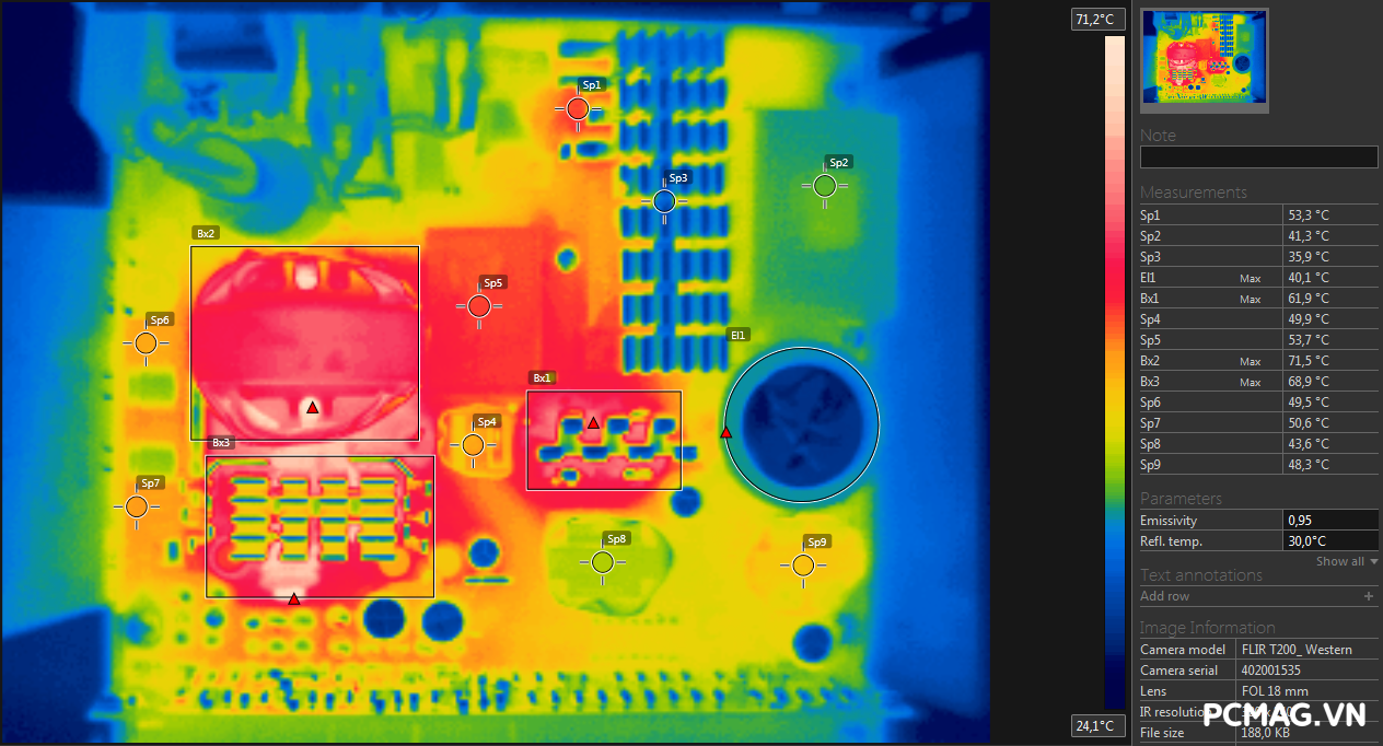 Nhờ đó, bộ nguồn duy trì nhiệt độ hoạt động khá mát. Qua ảnh nhiệt, có thể thấy khu vực nóng nhất tập trung ở ngõ ra biến áp chính và các MOSFET chỉnh lưu đồng bộ, với nhiệt độ chỉ vào khoảng trên 70°C, cho thấy khả năng tản nhiệt được kiểm soát tốt.