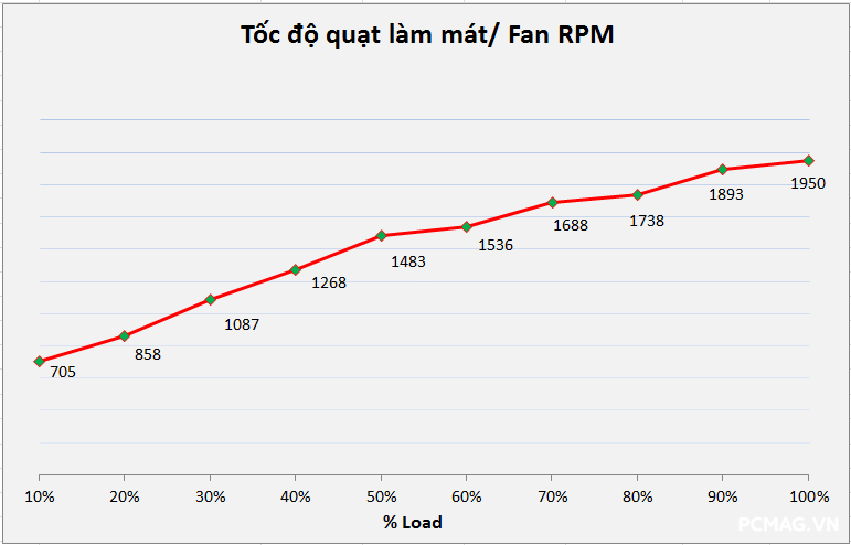 Fury GD 850W được thử nghiệm trong trạng thái tắt chế độ semi-fanless, do đó quạt sẽ hoạt động ngay khi cấp nguồn. Tốc độ quạt tăng dần từ khoảng 700 RPM và có thể đạt tối đa gần 2000 RPM khi tải cao.