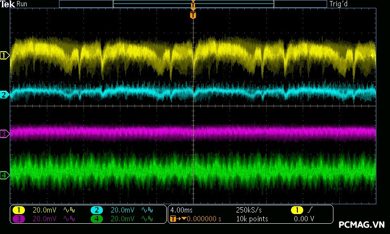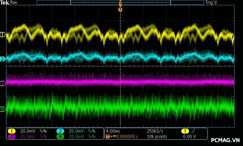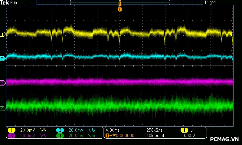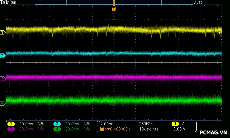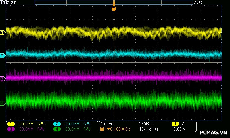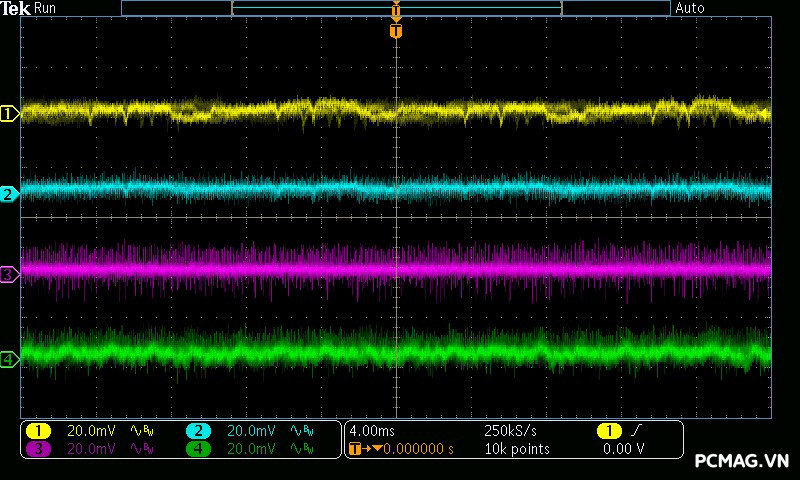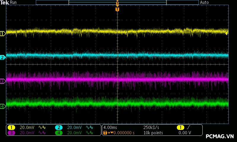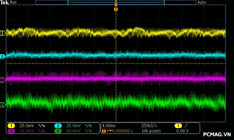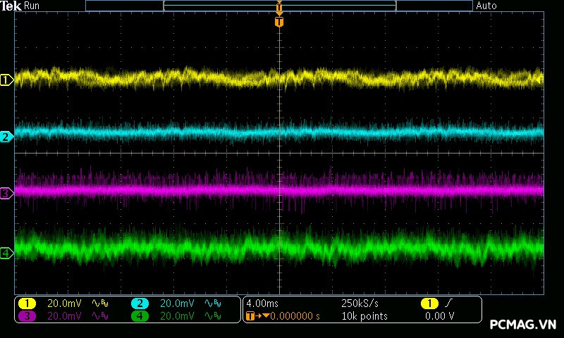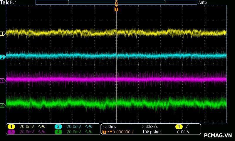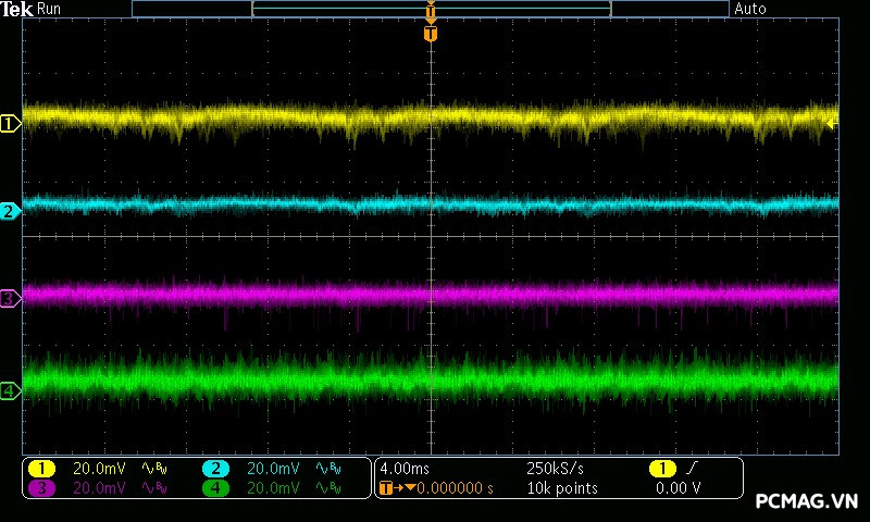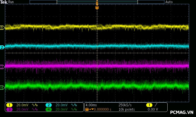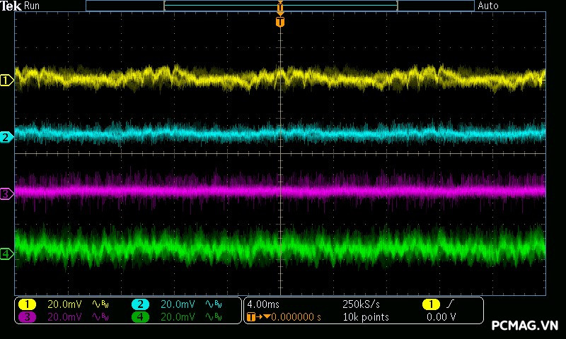 Trong khi đó, XP650 cho kết quả ở mức khá, với đường 12V ghi nhận mức nhiễu cao hơn, xấp xỉ 70mV.