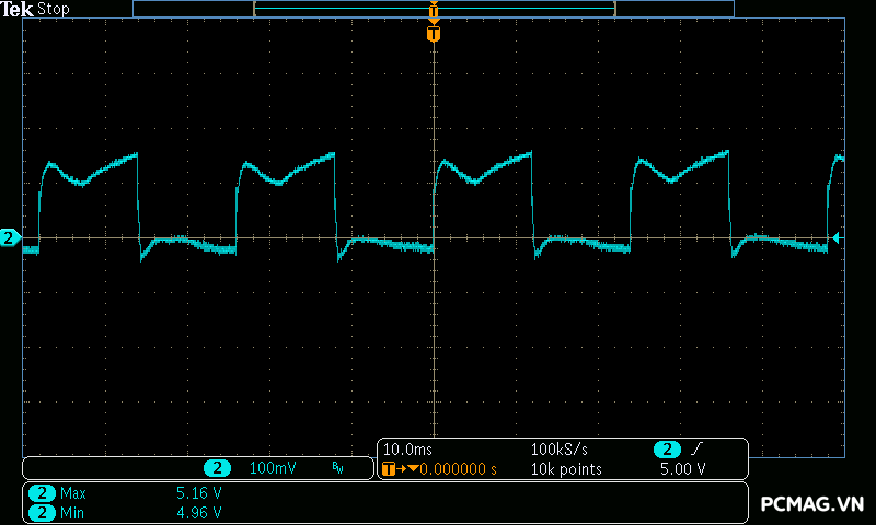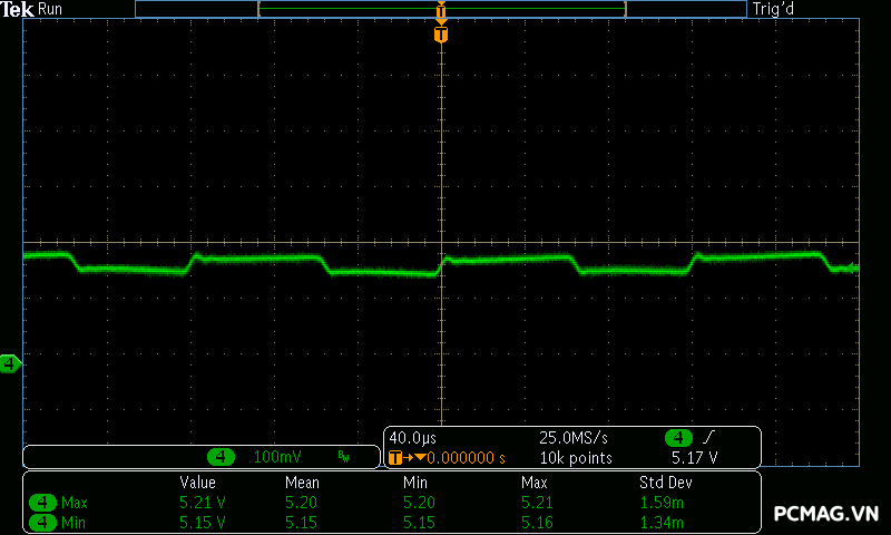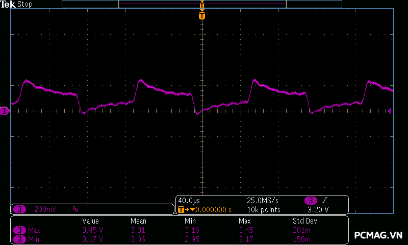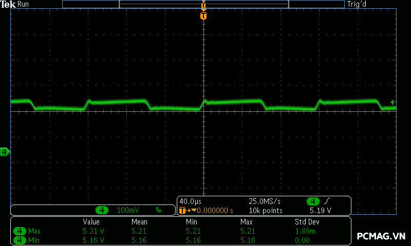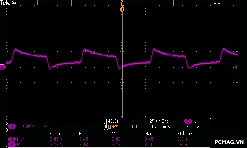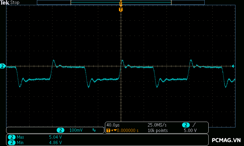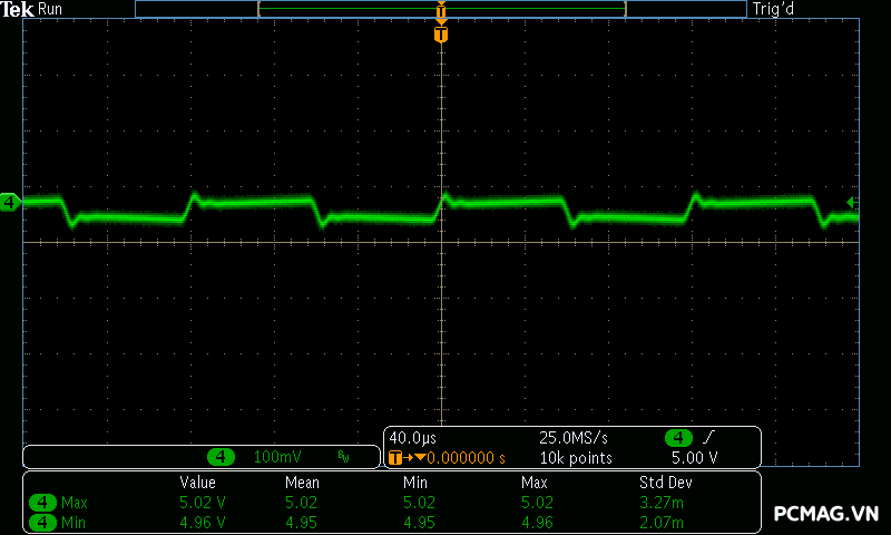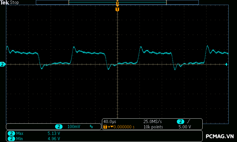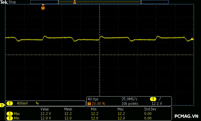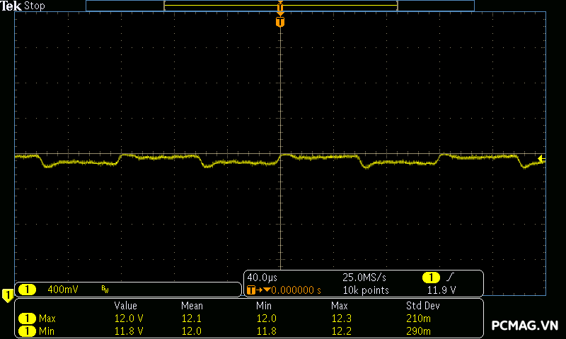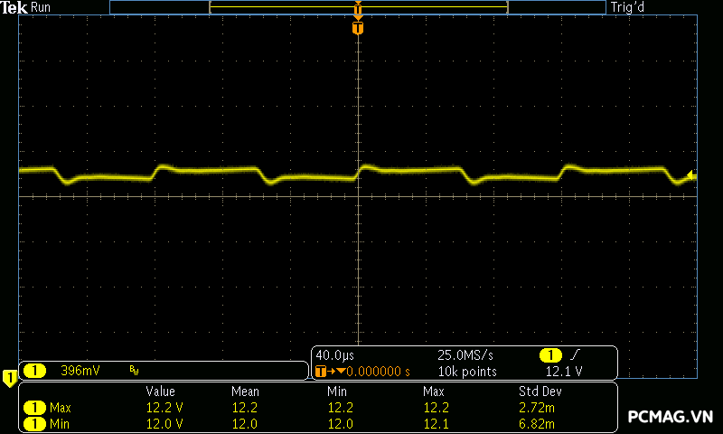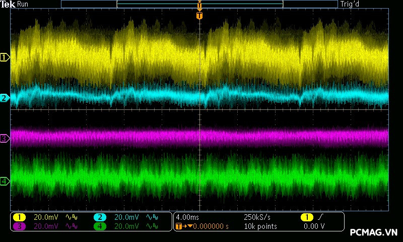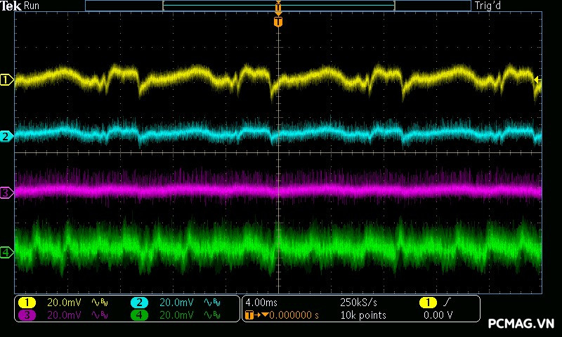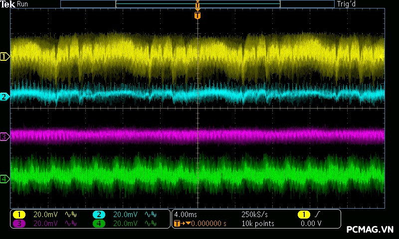 Trong khi đó, XP650 cho kết quả ở mức khá, với đường 12V ghi nhận mức nhiễu cao hơn, xấp xỉ 70mV.