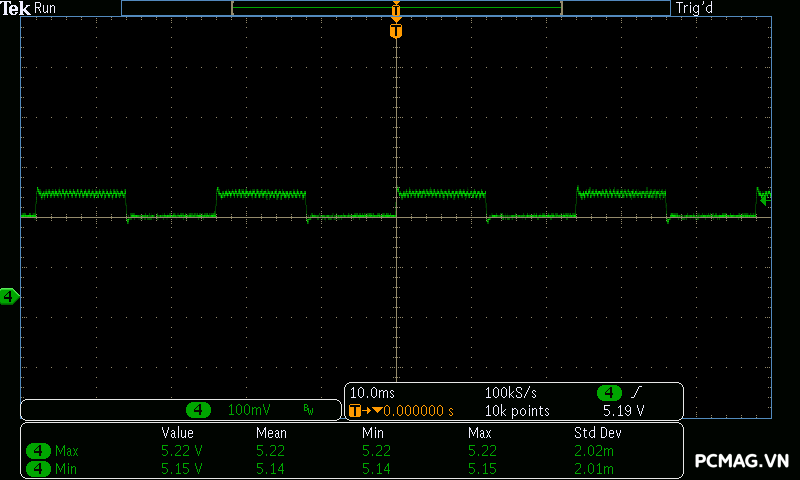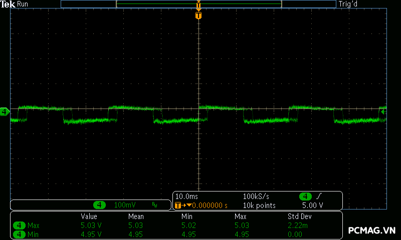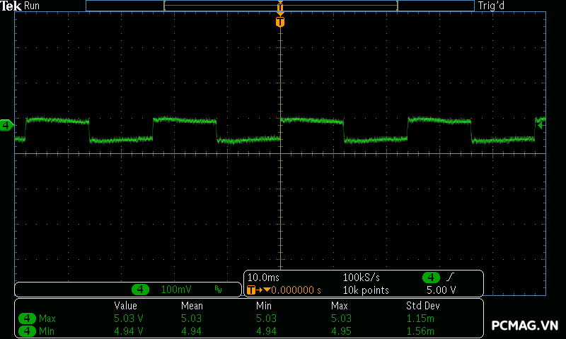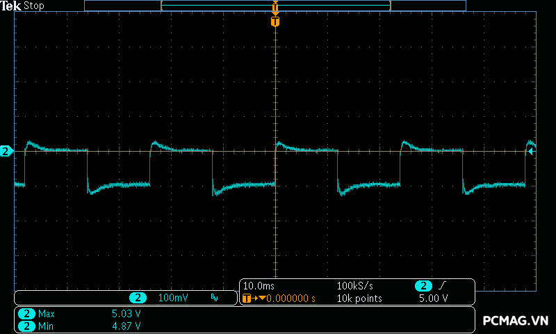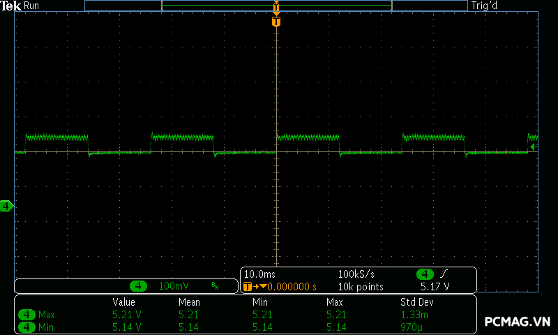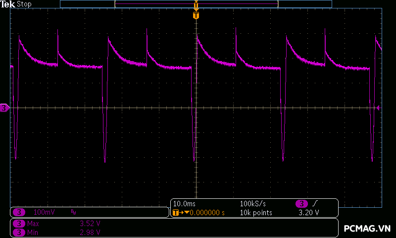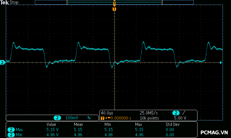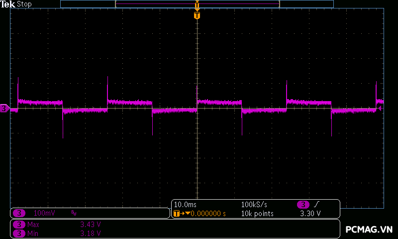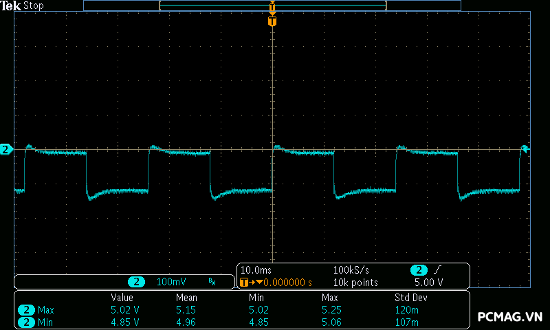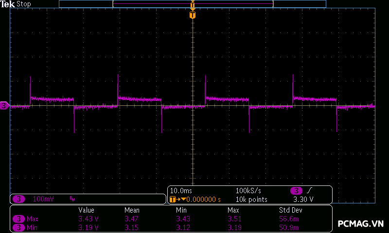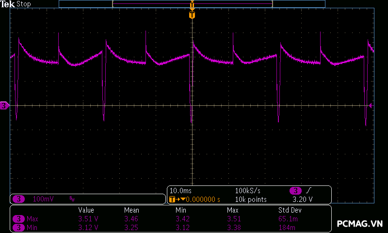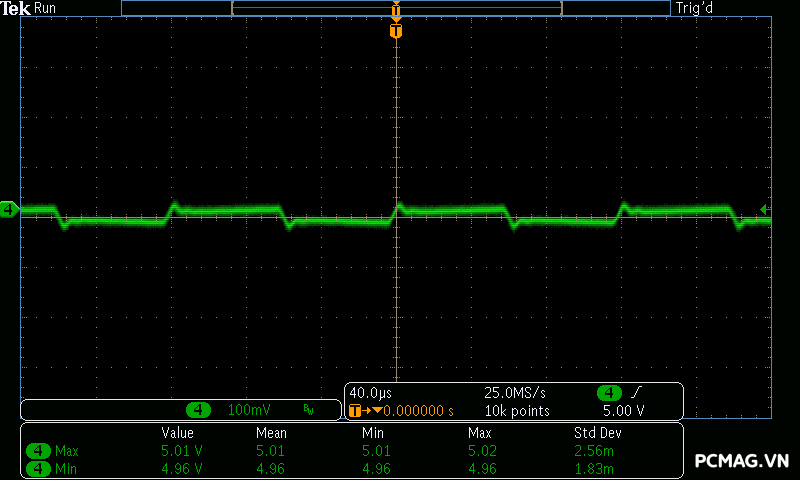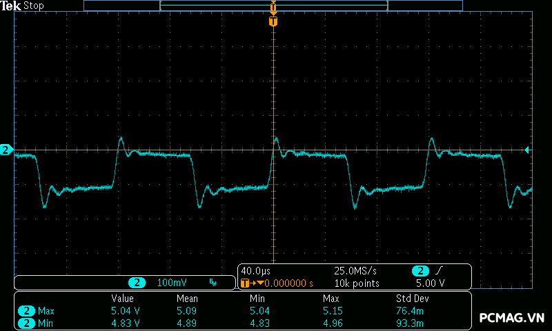 Trong khi đó, XP650 cho kết quả ở mức khá, với đường 12V ghi nhận mức nhiễu cao hơn, xấp xỉ 70mV.