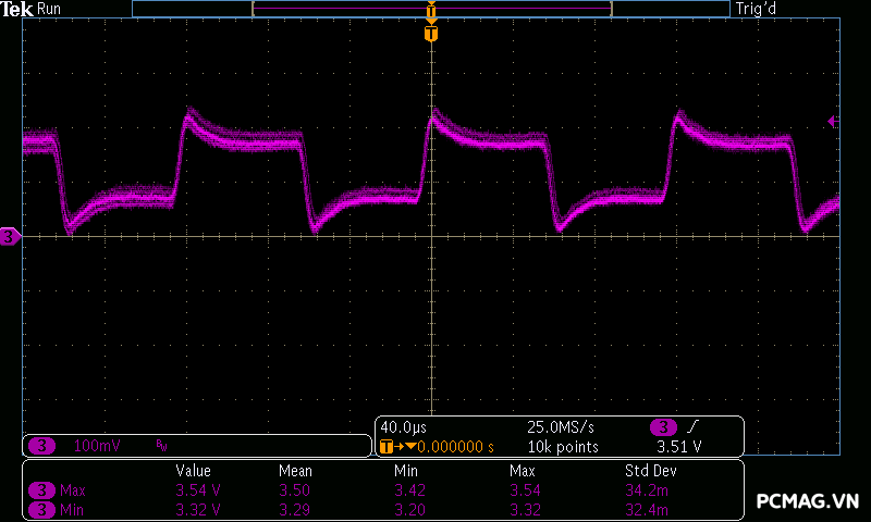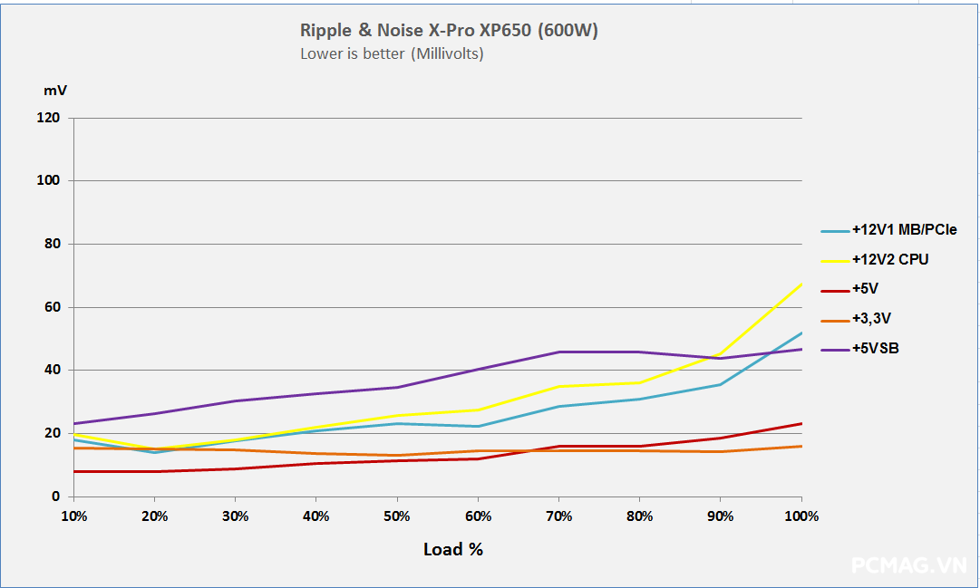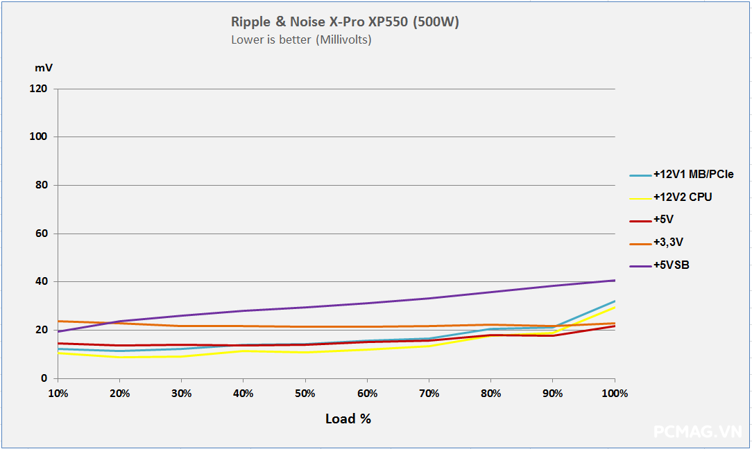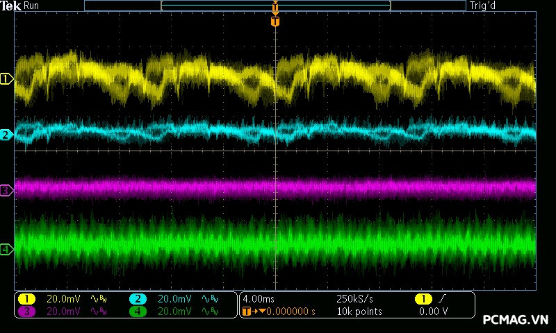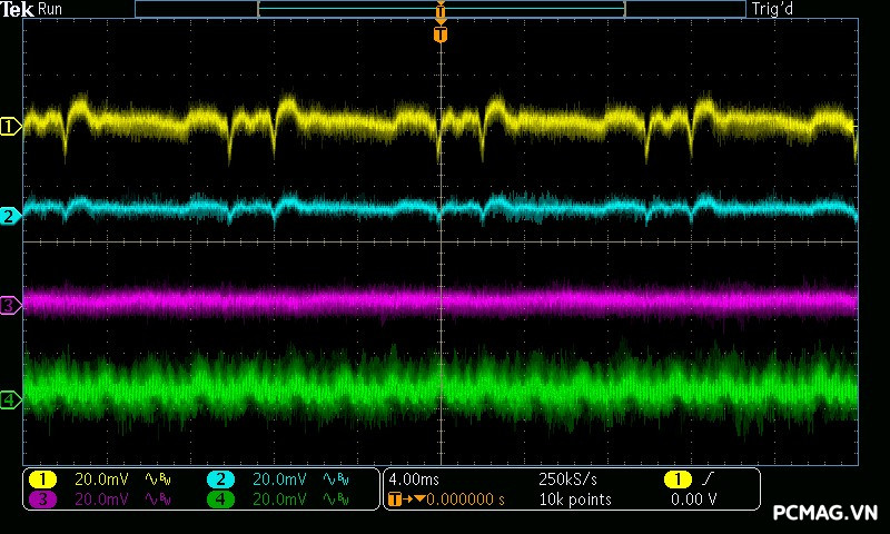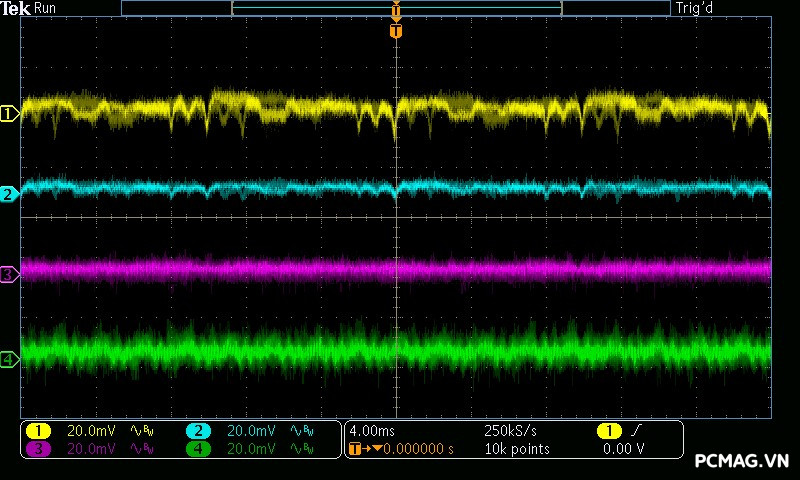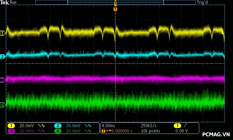 Với XP550, mức nhiễu được kiểm soát khá tốt khi cả ba đường điện đều duy trì dưới ngưỡng 40mV.