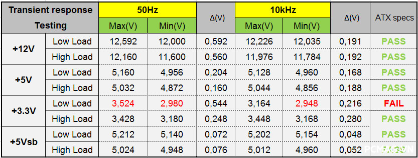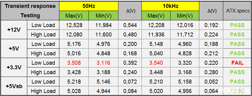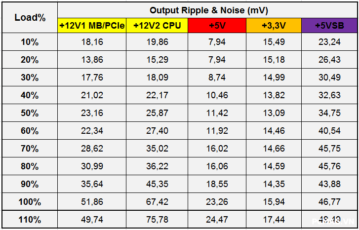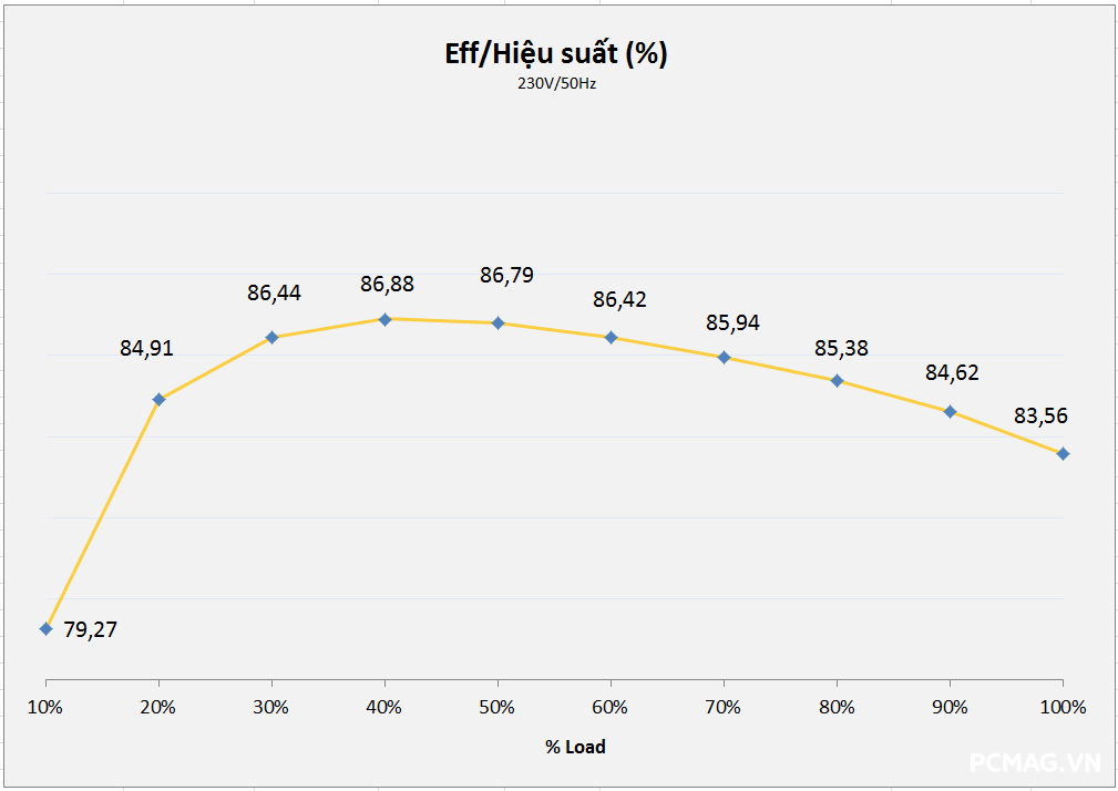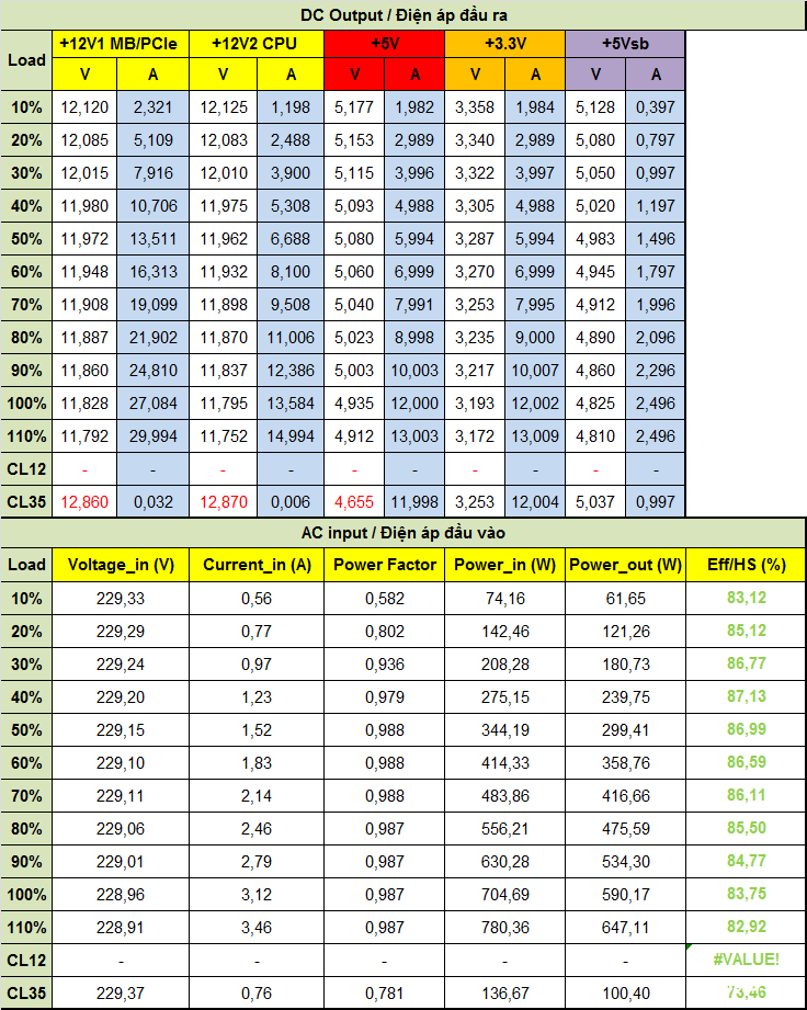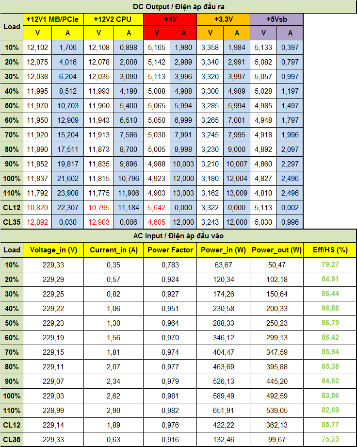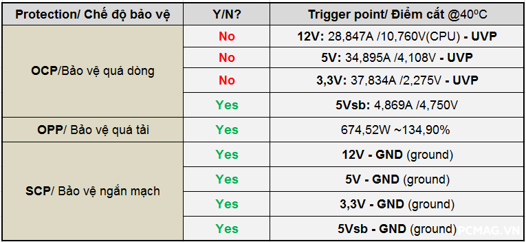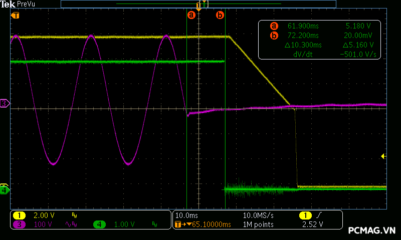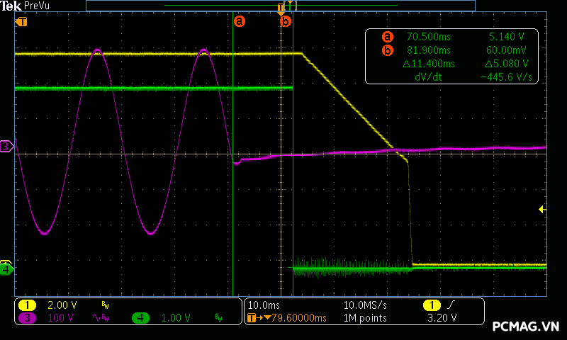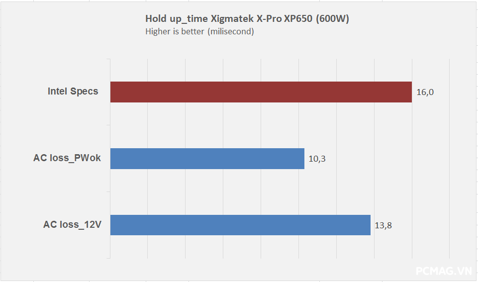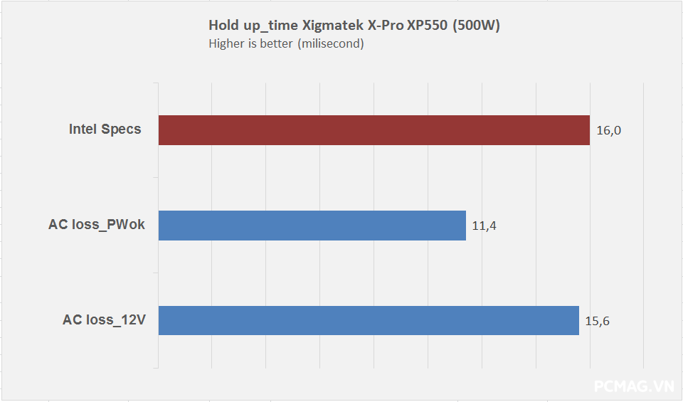 Cả hai phiên bản đều có thời gian lưu điện khoảng 10ms, chưa đáp ứng được yêu cầu tối thiểu 16ms theo tiêu chuẩn ATX.