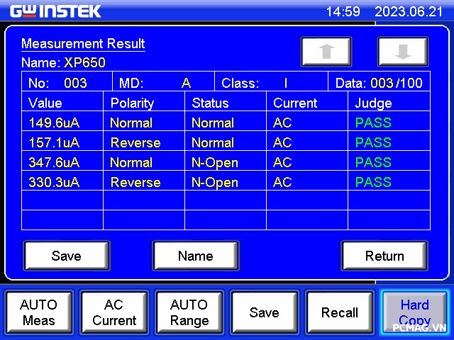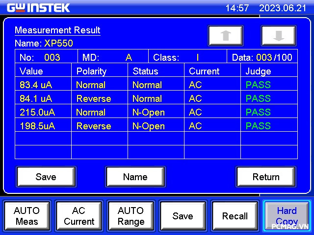 Để đánh giá chỉ số này, bài test sử dụng thiết bị đo chuyên dụng GW Instek GLC-9000, giúp xác định chính xác mức dòng rò trong quá trình vận hành.