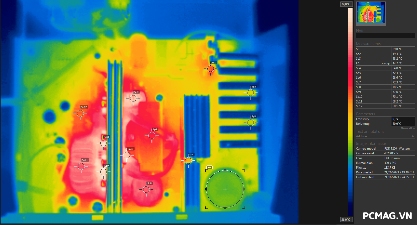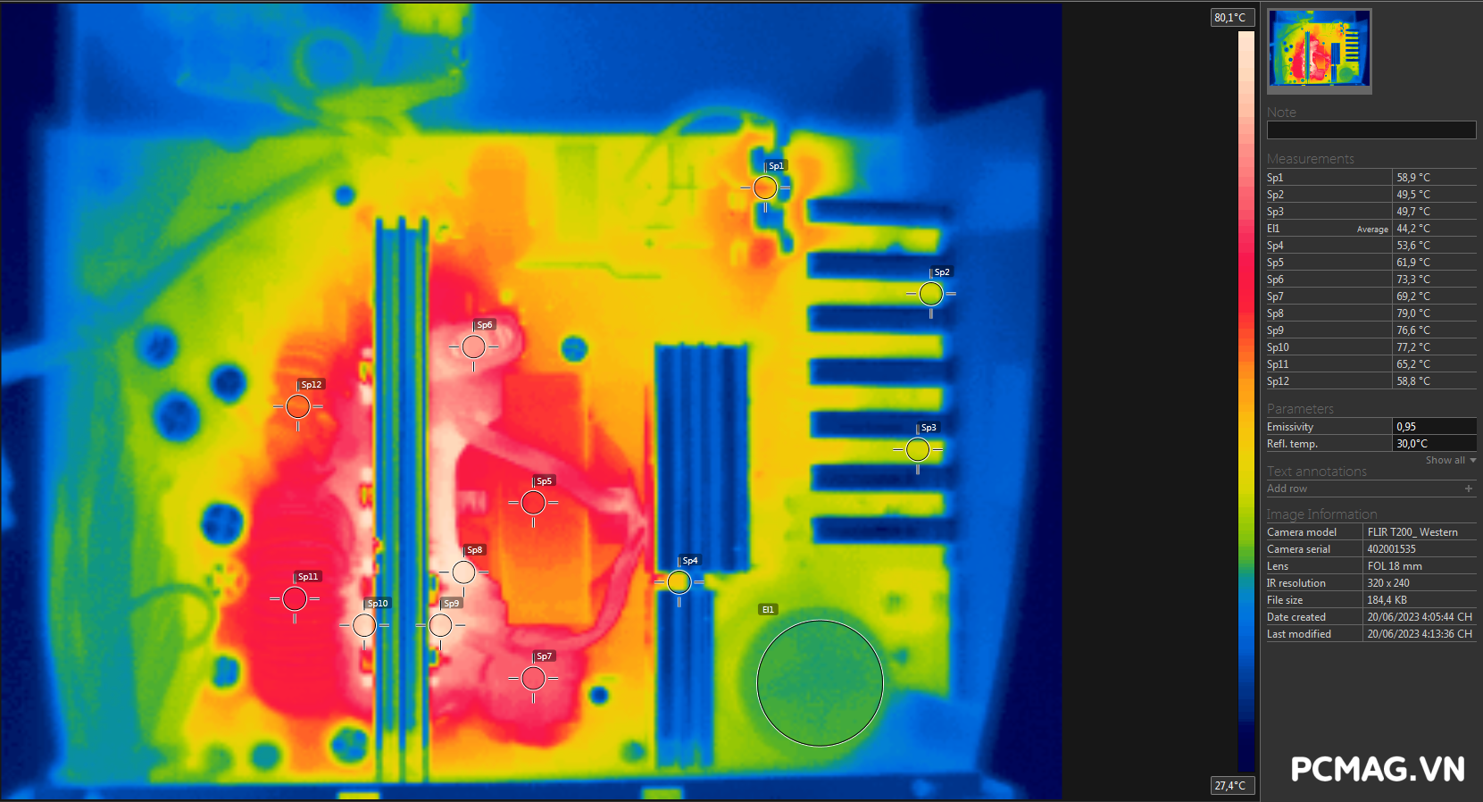 Trong điều kiện môi trường từ 38–45°C, cả hai phiên bản ghi nhận mức nhiệt tối đa dao động quanh 80°C. Điểm nóng chủ yếu tập trung tại khu vực đầu ra biến áp chính và các diode chỉnh lưu ở ngõ ra.