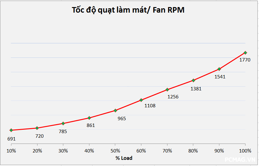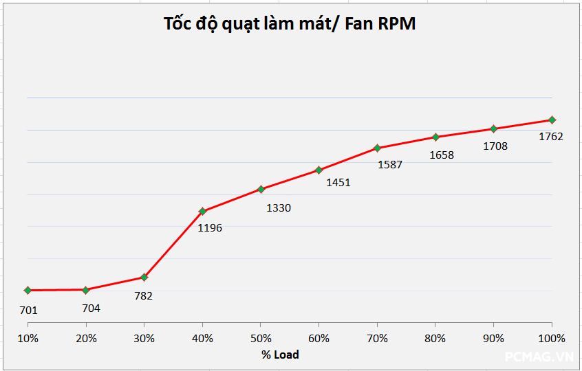 Về hệ thống làm mát, fan curve được tinh chỉnh khá dễ chịu trong phân khúc. Quạt chỉ hoạt động quanh mức ~1000RPM trong phần lớn thời gian và chỉ tăng lên tối đa khoảng 1700RPM khi nhiệt độ tăng cao, giúp cân bằng giữa hiệu năng tản nhiệt và độ ồn.