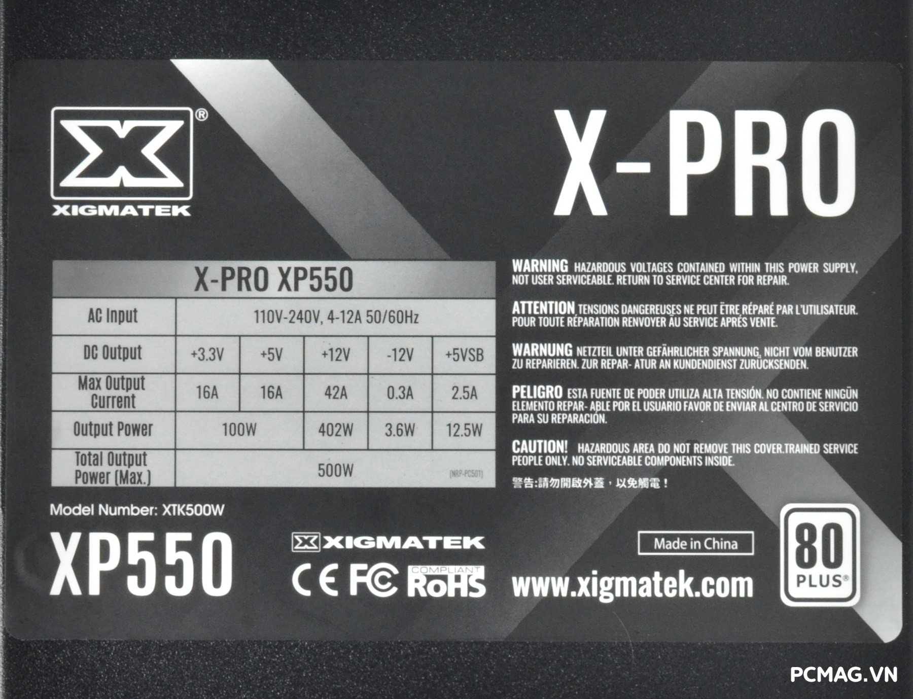 Riêng phiên bản XP550 có một sai sót nhỏ trên tem thông số: dòng 12V được in là 42A, trong khi thông số chính xác là 33.5A, tương ứng với tổng công suất đường 12V đạt 402W.