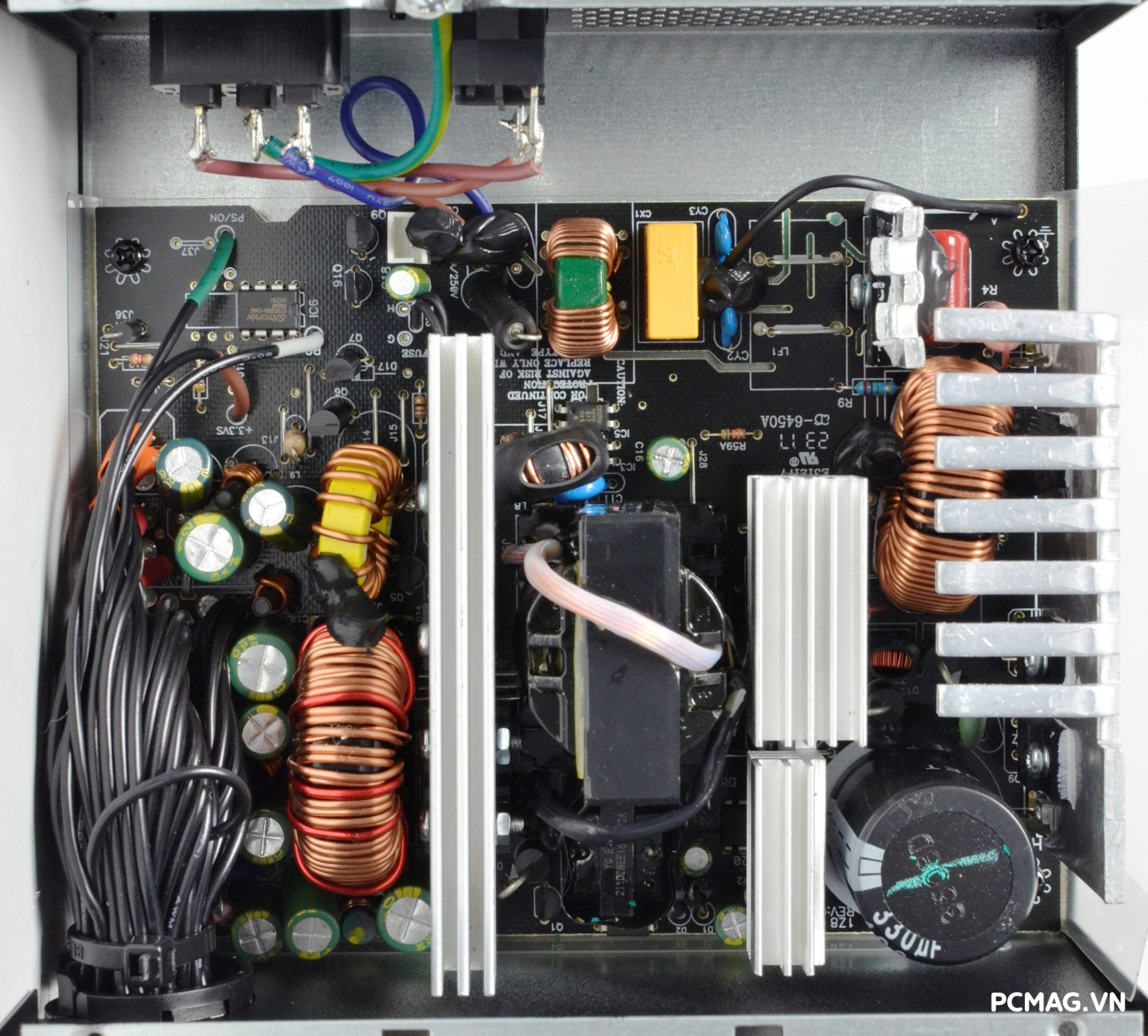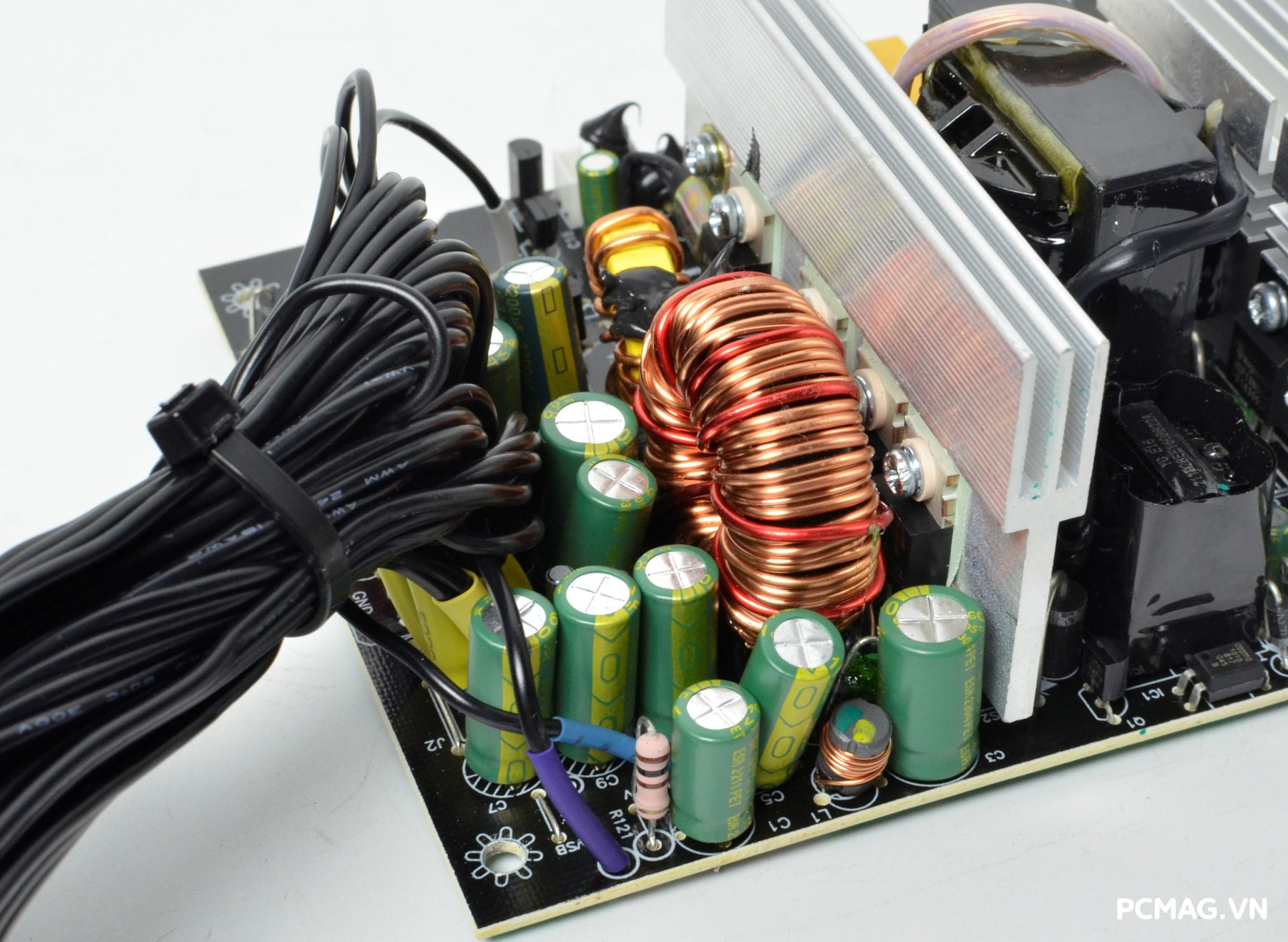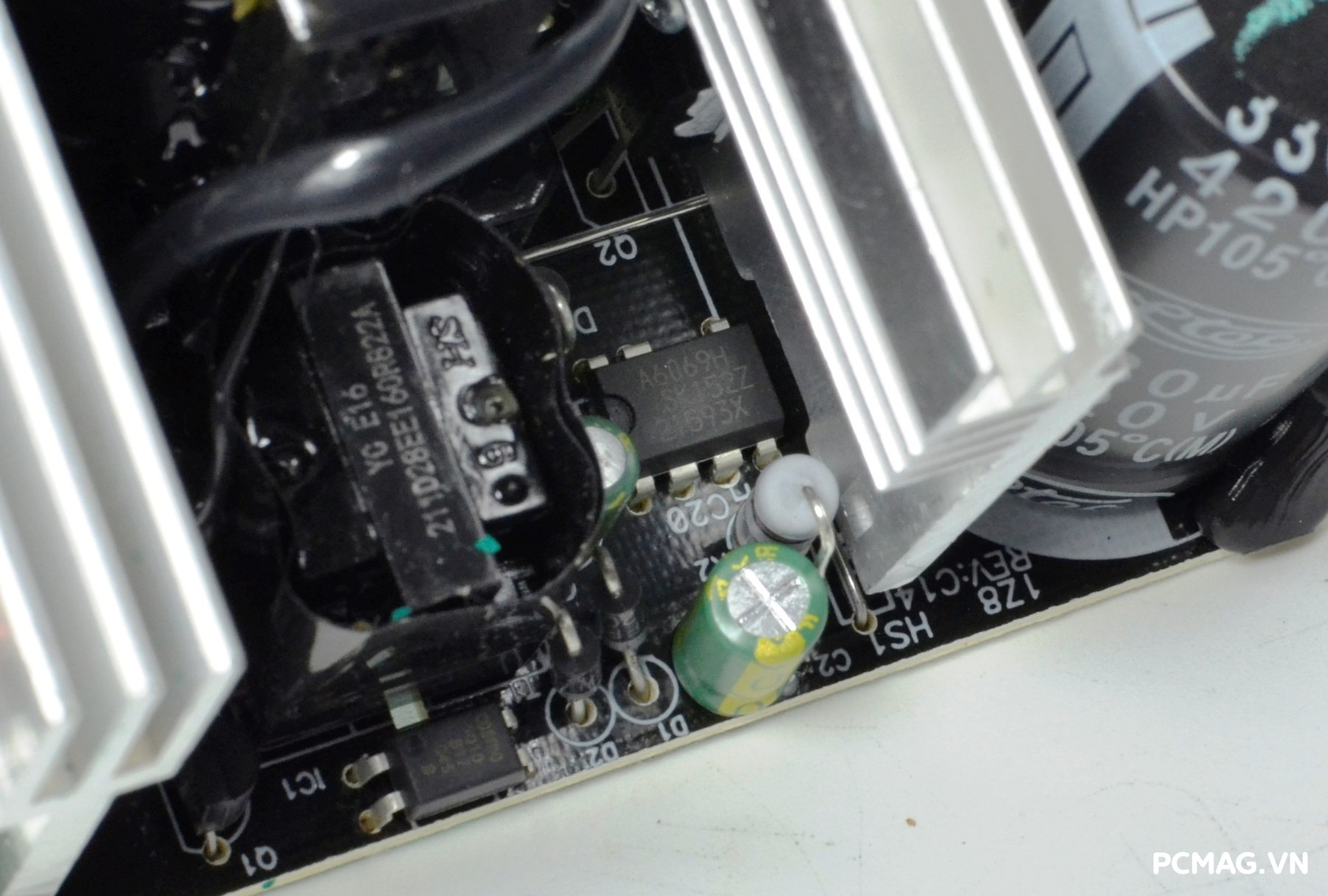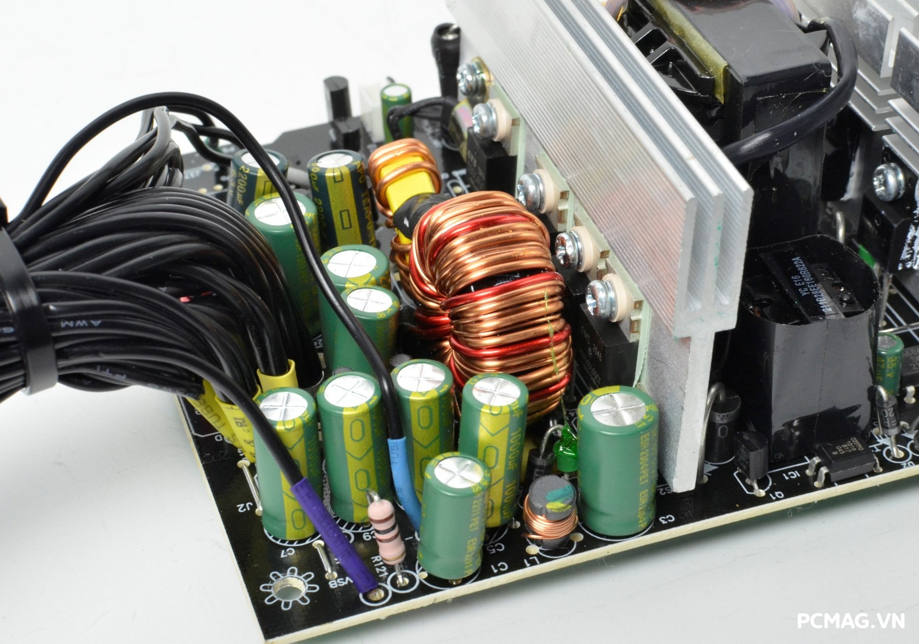 Bên cạnh đó là khu vực mạch lọc LC, sử dụng các tụ lọc đến từ Teapo và Hangcon, đảm nhiệm vai trò làm sạch điện áp đầu ra trước khi cấp tới các linh kiện trong hệ thống.