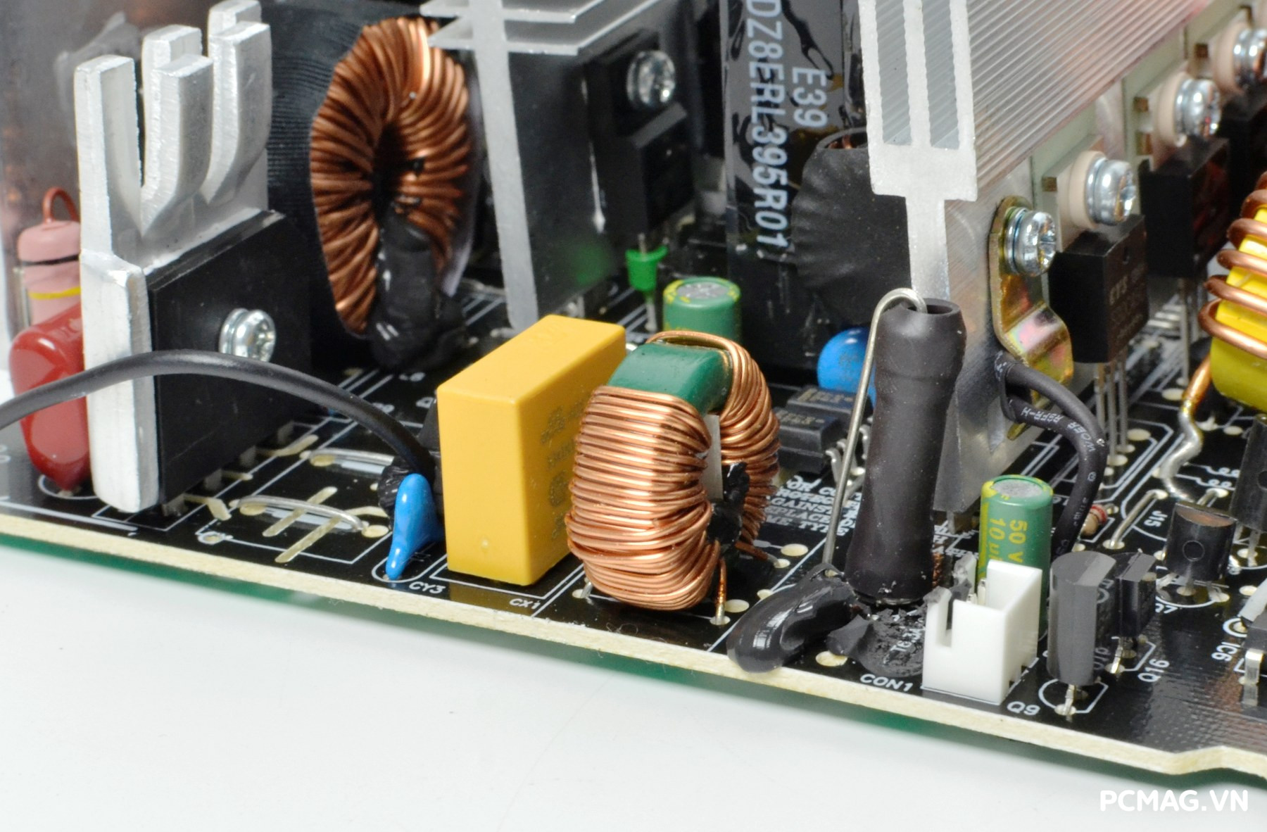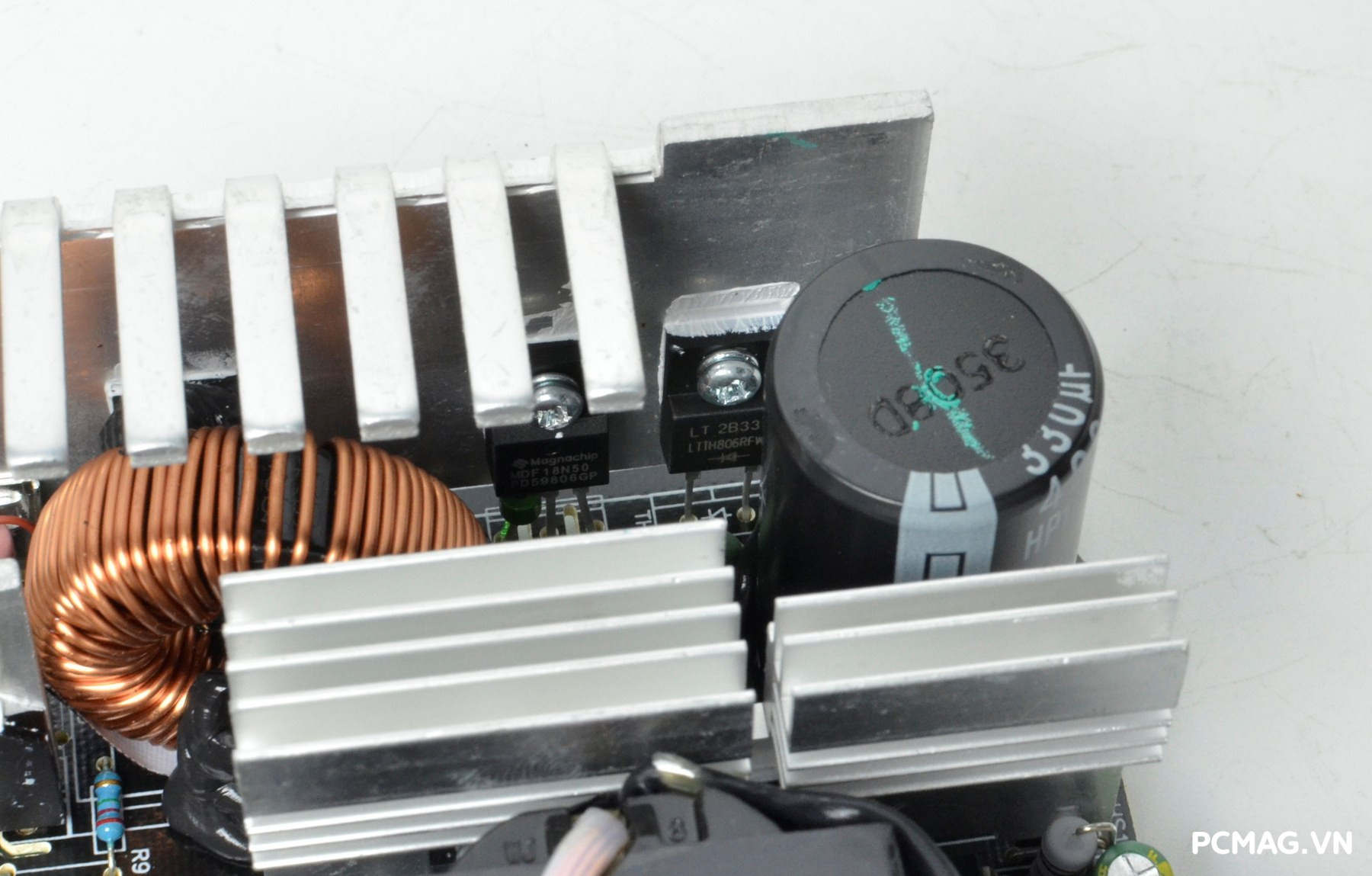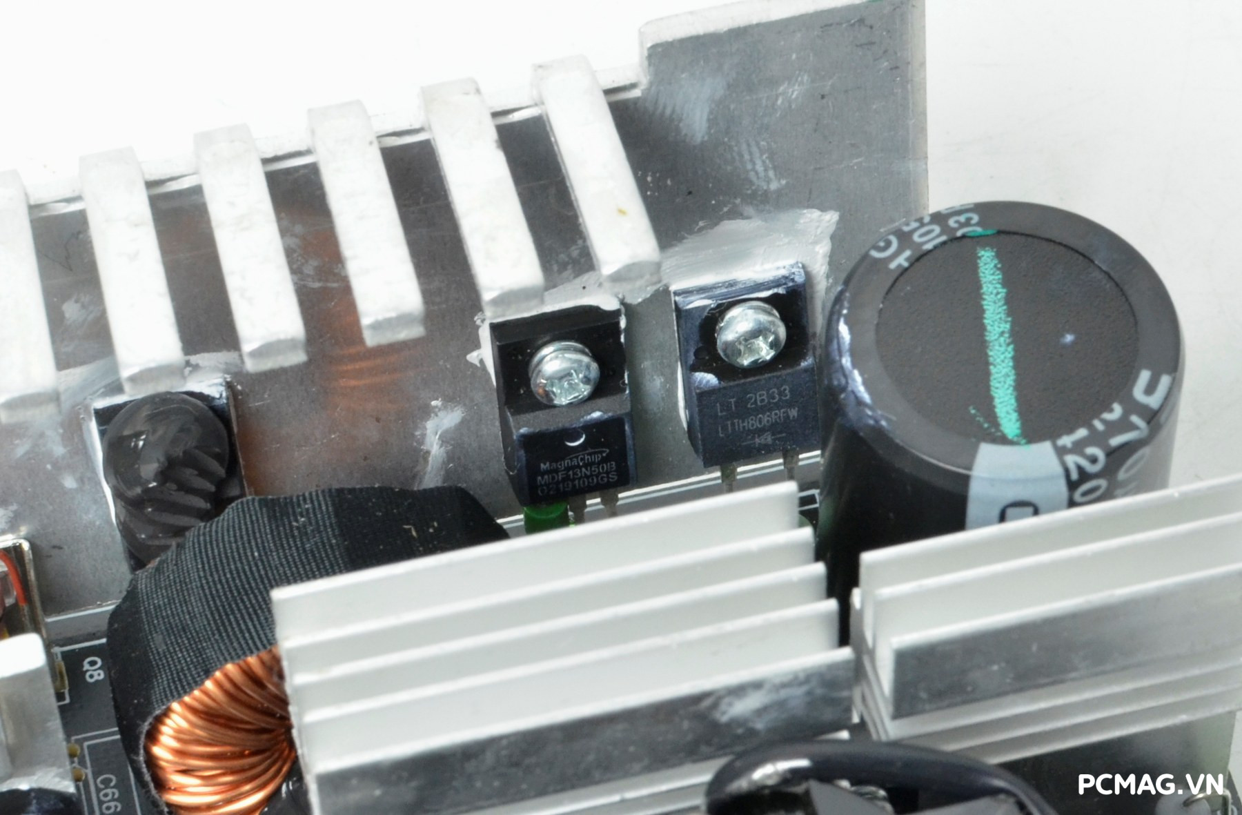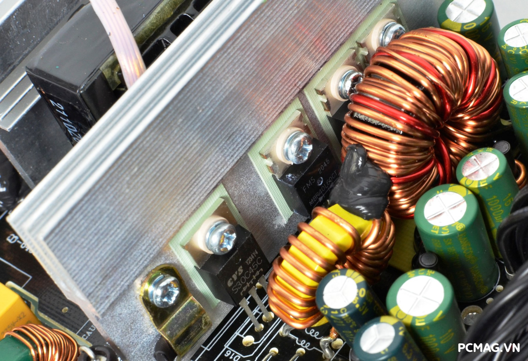 Bên cạnh đó là khu vực mạch lọc LC, sử dụng các tụ lọc đến từ Teapo và Hangcon, đảm nhiệm vai trò làm sạch điện áp đầu ra trước khi cấp tới các linh kiện trong hệ thống.