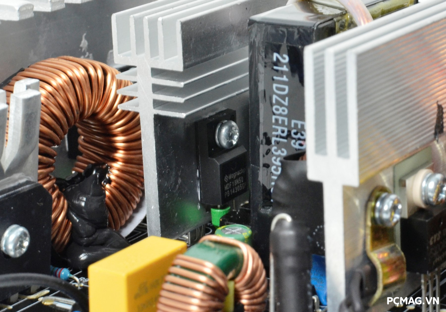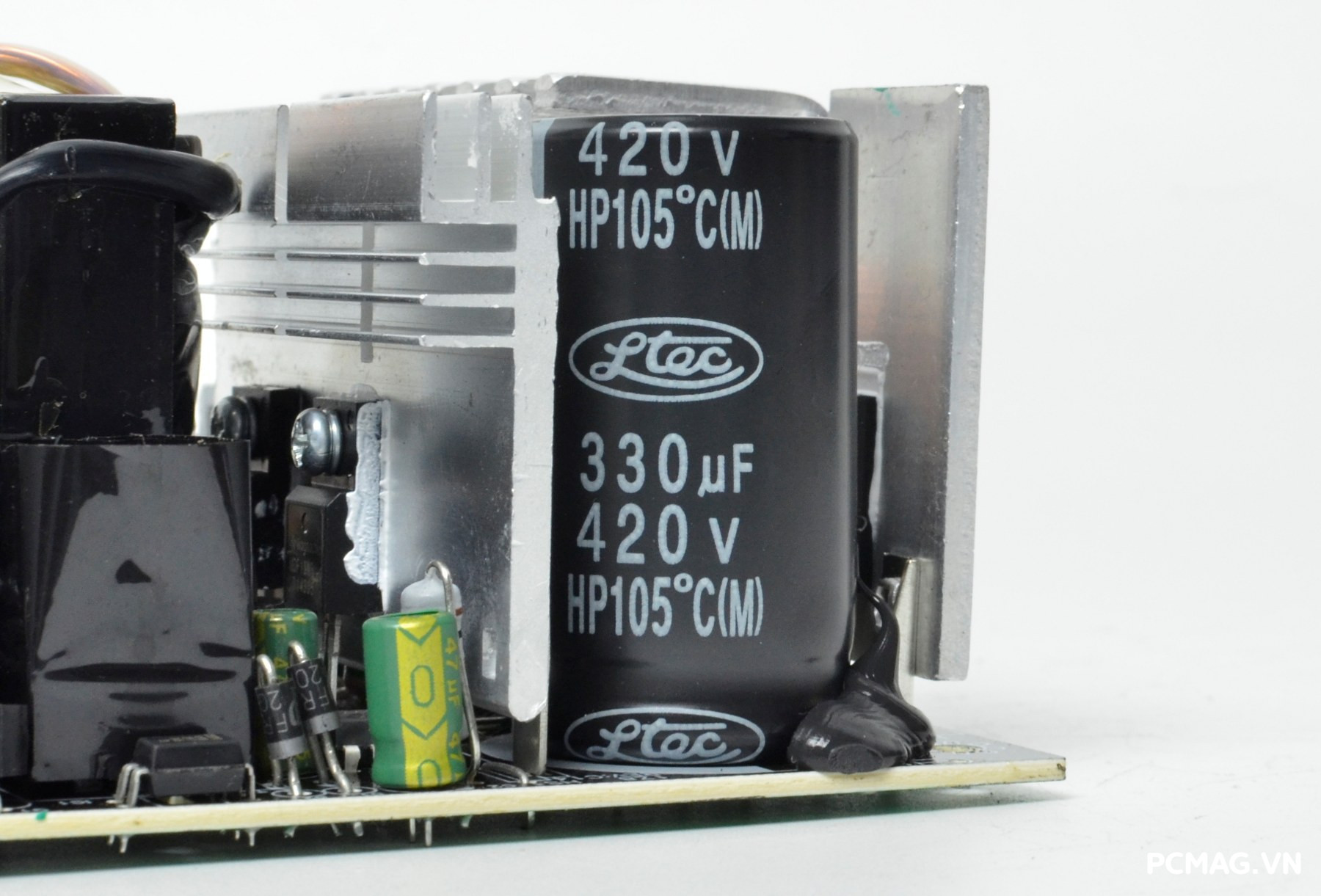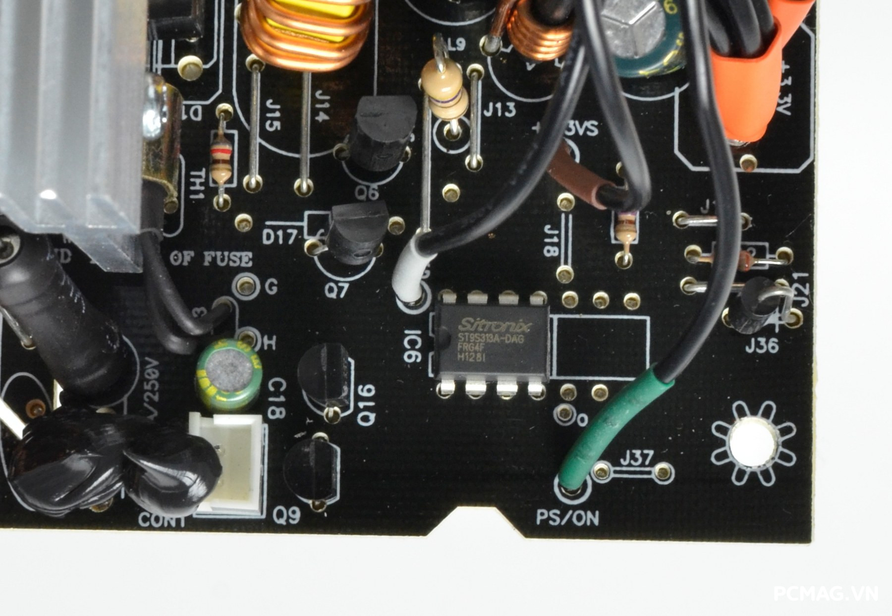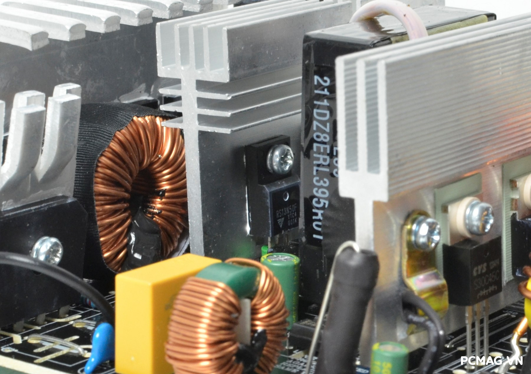 Bên cạnh đó là khu vực mạch lọc LC, sử dụng các tụ lọc đến từ Teapo và Hangcon, đảm nhiệm vai trò làm sạch điện áp đầu ra trước khi cấp tới các linh kiện trong hệ thống.