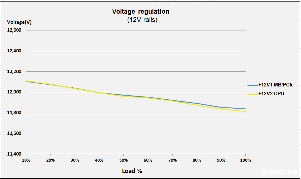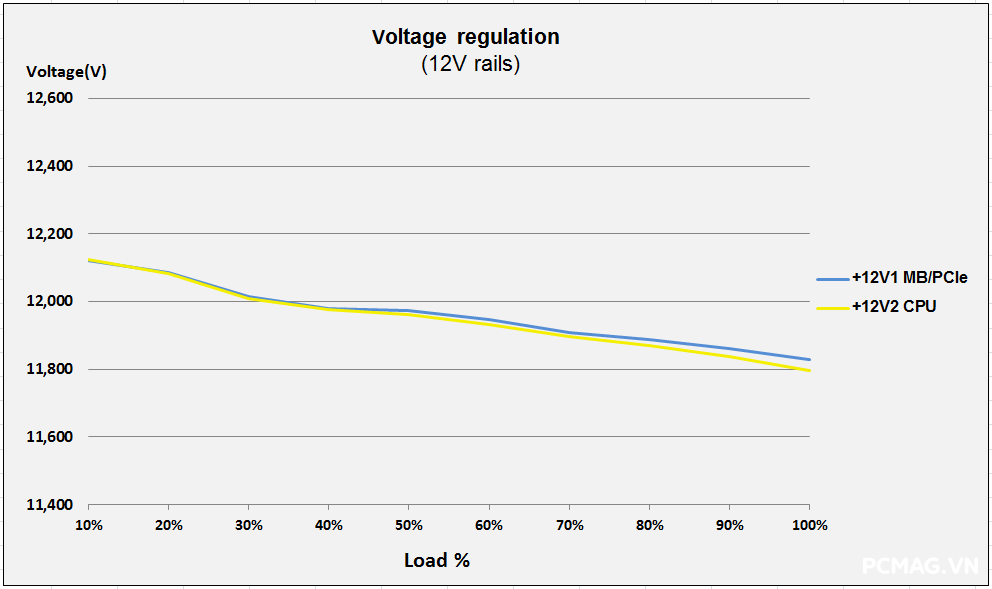 Để đơn giản hóa việc theo dõi số liệu theo tiêu chuẩn ATX 3.0 từ Intel, đường 12V được chia thành 2 nhánh trong bài test đối với nguồn single rail: