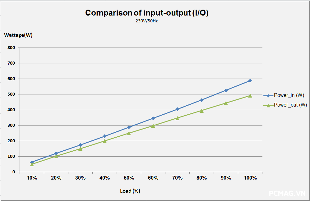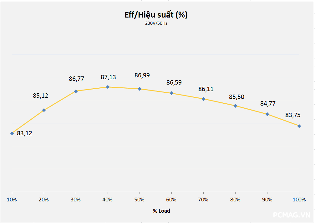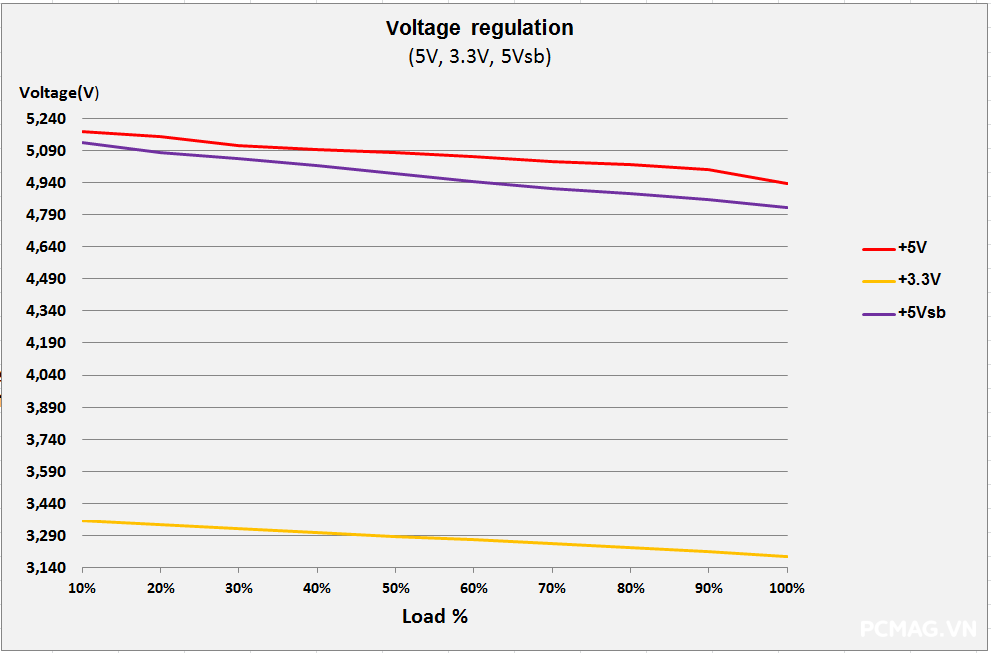 Với XP550, điện áp vẫn nằm trong giới hạn cho phép của chuẩn ATX ở điều kiện tải thông thường. Tuy nhiên, do không sử dụng thiết kế DC-to-DC, khi xuất hiện tình huống tải lệch giữa các đường, độ ổn định điện áp suy giảm nhanh và có xu hướng vượt khỏi ngưỡng tiêu chuẩn. Bù lại, hiệu suất đạt mức khá tốt, xấp xỉ 87% tại 230Vac.