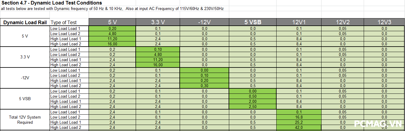 - Dung tải (Capacitance load): 3300µF cho mỗi đường (12V1, 12V2, 5V, 3.3V, 5Vsb)