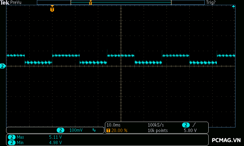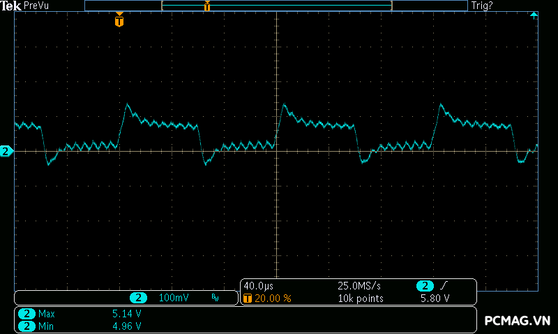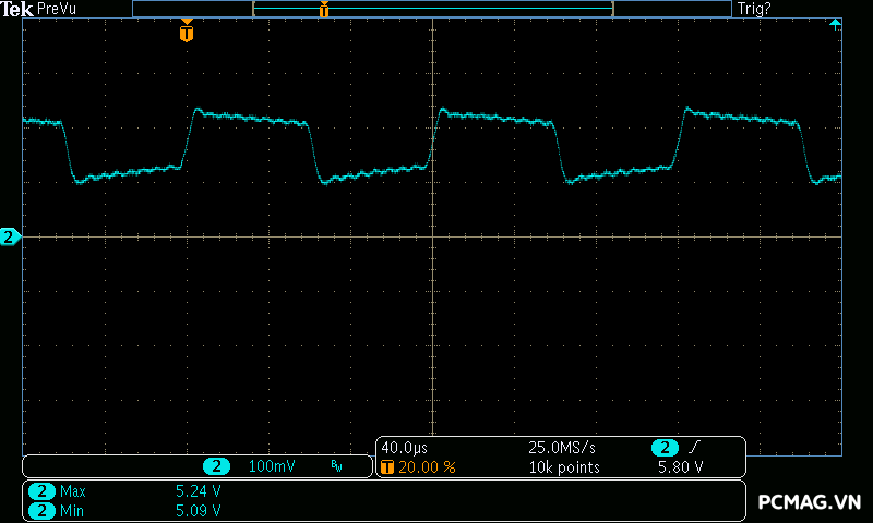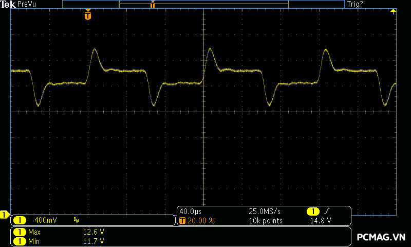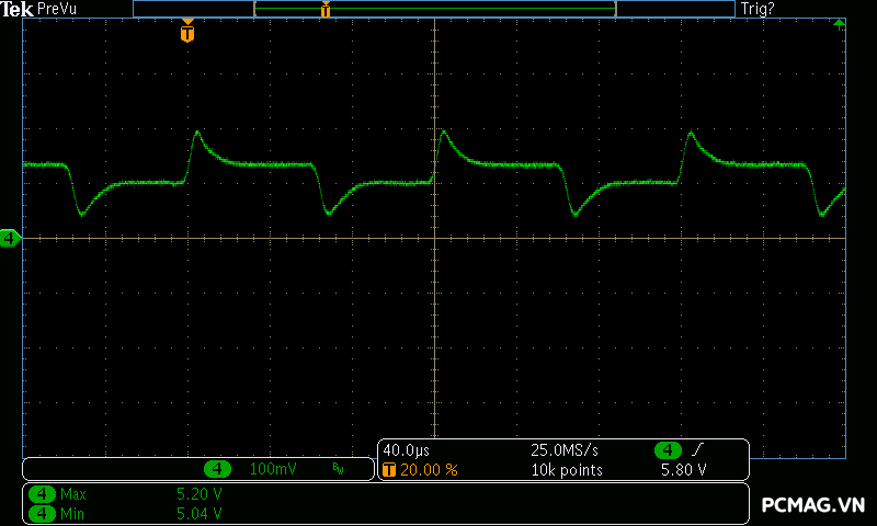 TW-P750G ghi nhận mức dòng khởi động khoảng 91A, nằm ở ngưỡng trung bình so với các bộ nguồn cùng phân khúc, cho thấy khả năng kiểm soát dòng vào khi khởi động ở mức chấp nhận được.