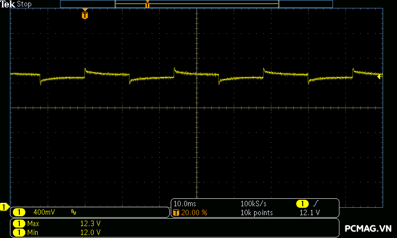 Tín hiệu Power OK trên Infinity ECO 450W V2 chưa được căn chỉnh tối ưu, khi thời điểm ngắt tín hiệu xảy ra sau khi đường 12V đã vượt ra khỏi giới hạn cho phép của tiêu chuẩn ATX. Điều này cho thấy mạch giám sát vẫn còn độ trễ nhất định trong quá trình phản hồi khi điện áp sụt giảm.