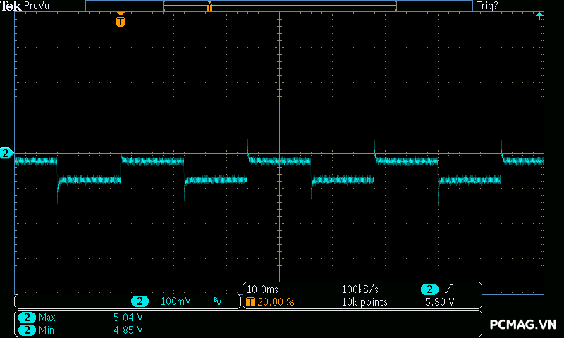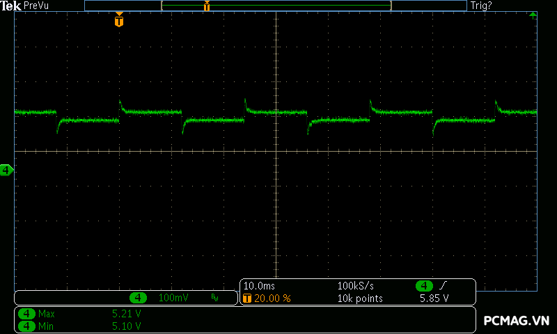 Trong thử nghiệm thực tế, ở đường 3.3V, IC đã kích hoạt bảo vệ khá kịp thời trước khi vượt quá giới hạn an toàn. Trong khi đó, với đường 5V, thời điểm kích OCP có phần chậm hơn đôi chút, cho thấy biên độ bảo vệ vẫn chưa thực sự tối ưu.