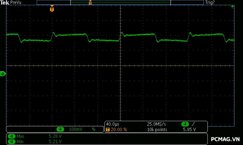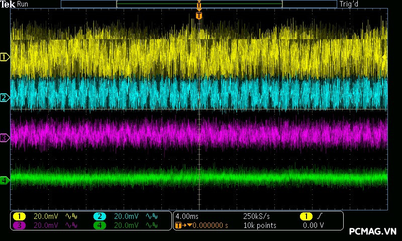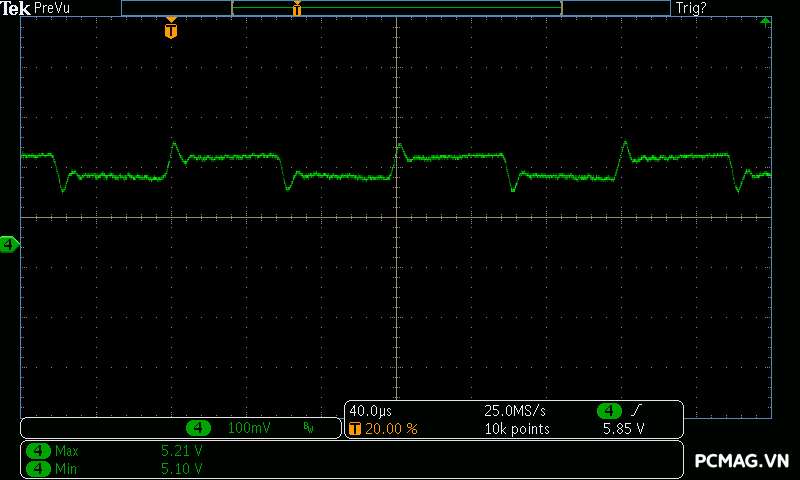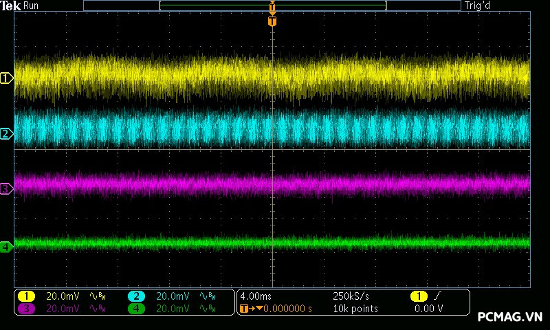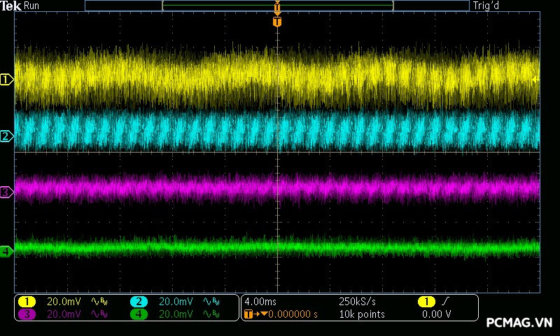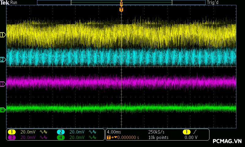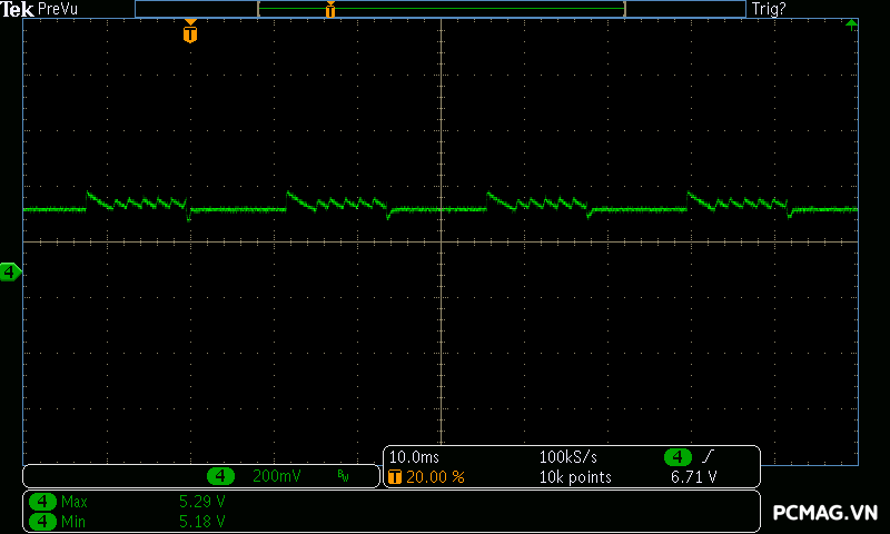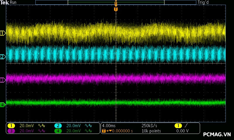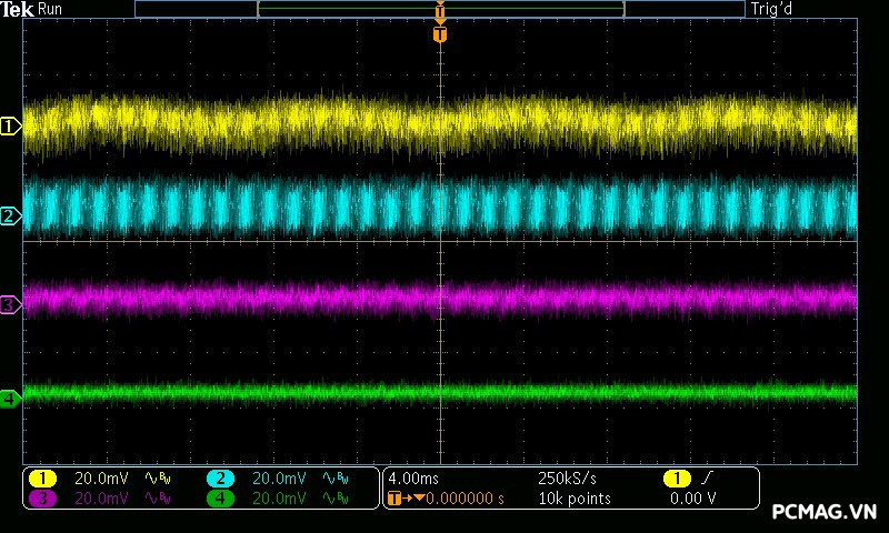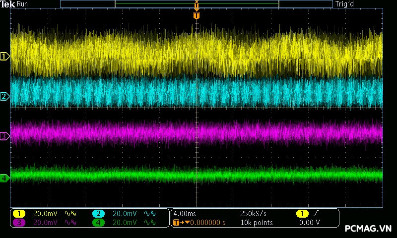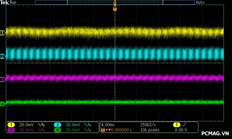 Mức nhiễu cao tần (Ripple & Noise) của Infinity ECO 450W V2 được ghi nhận ở mức trung bình trong phân khúc. Ở tải cao, đường 12V đạt tối đa khoảng 70mV, vẫn nằm trong giới hạn cho phép của tiêu chuẩn ATX. Các đường điện còn lại như 5V và 3.3V dao động quanh mức 30mV, cho thấy khả năng lọc nhiễu ở mức ổn định đối với một bộ nguồn phổ thông.