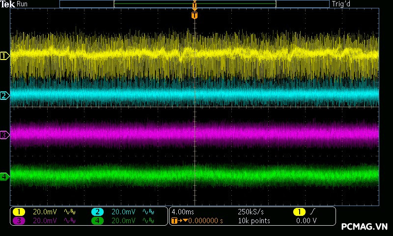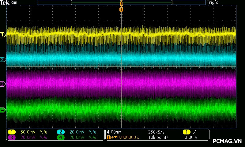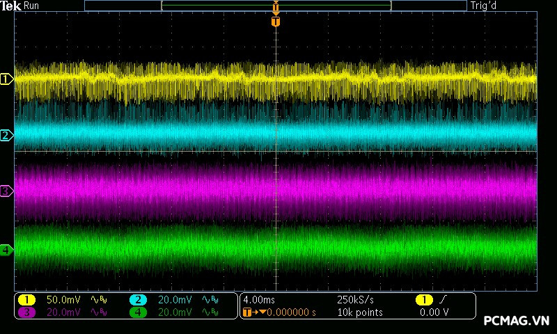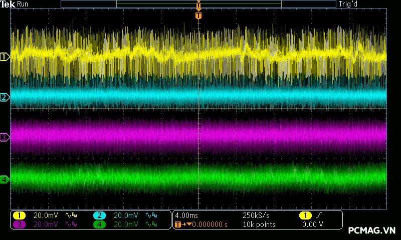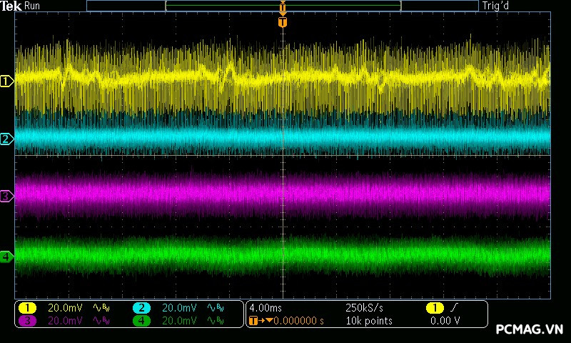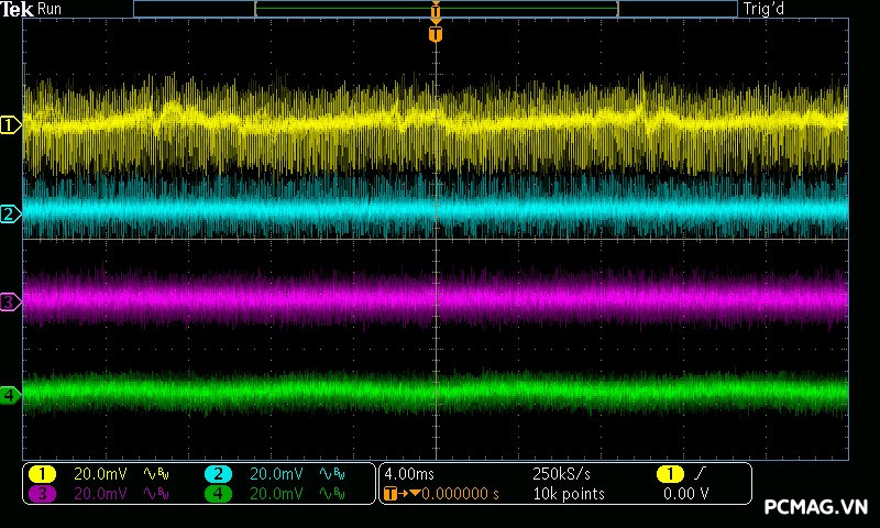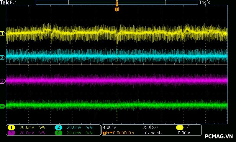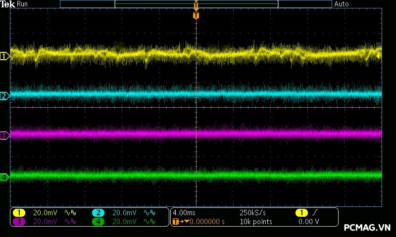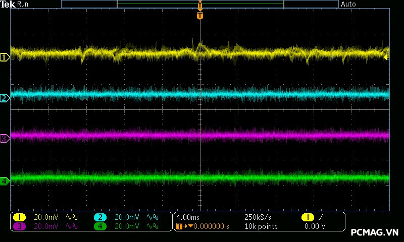 Trong bài kiểm tra Ripple & Noise, VSP Extreme TPS750 750W cho kết quả ở mức khá, với mức nhiễu trên các đường điện dao động khoảng dưới 65mV. Giá trị này vẫn nằm trong giới hạn cho phép của tiêu chuẩn ATX, đảm bảo nguồn điện cung cấp cho các linh kiện trong hệ thống được duy trì tương đối ổn định trong quá trình hoạt động.