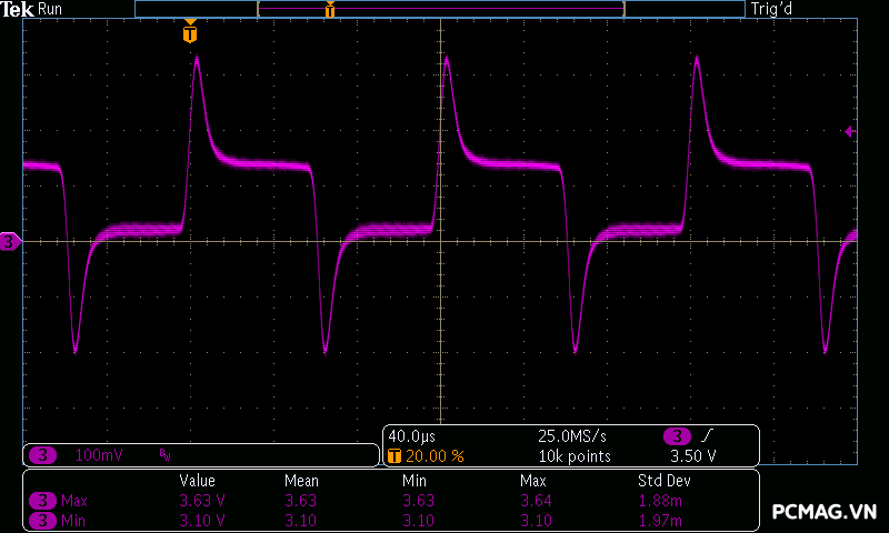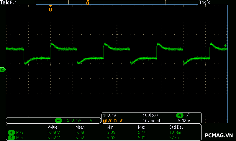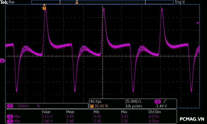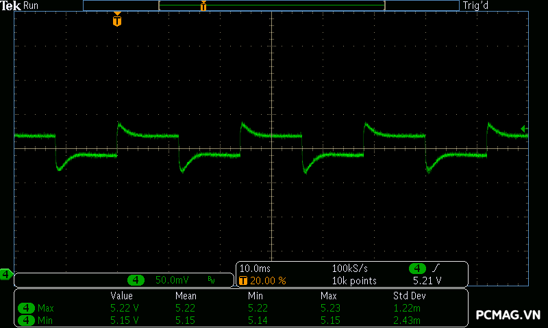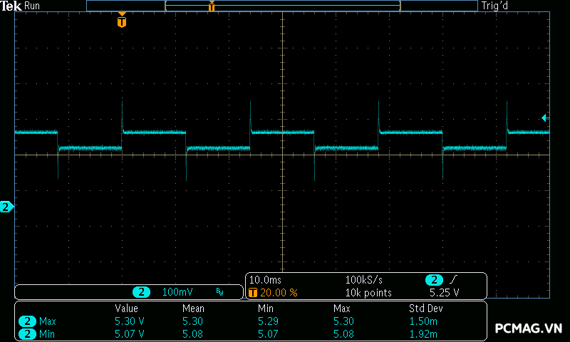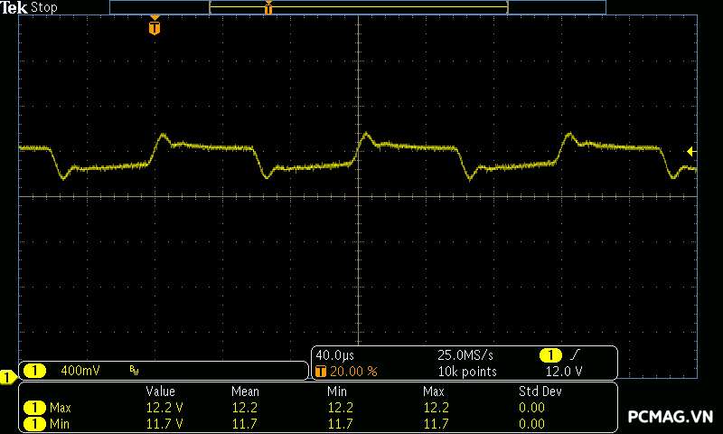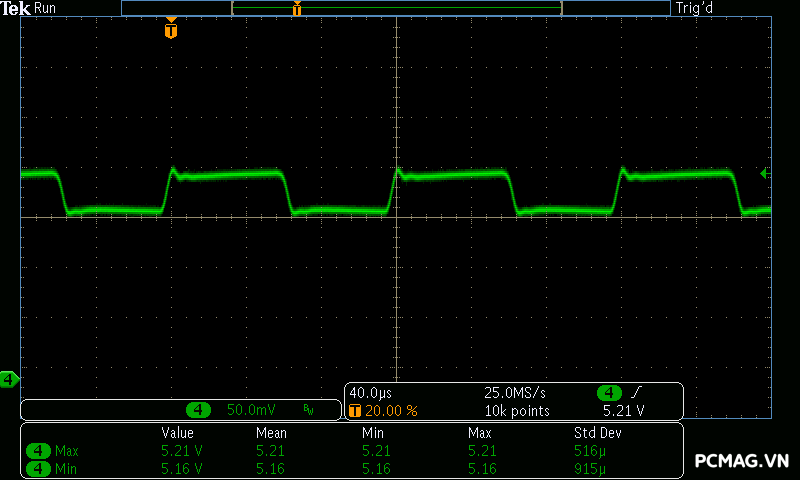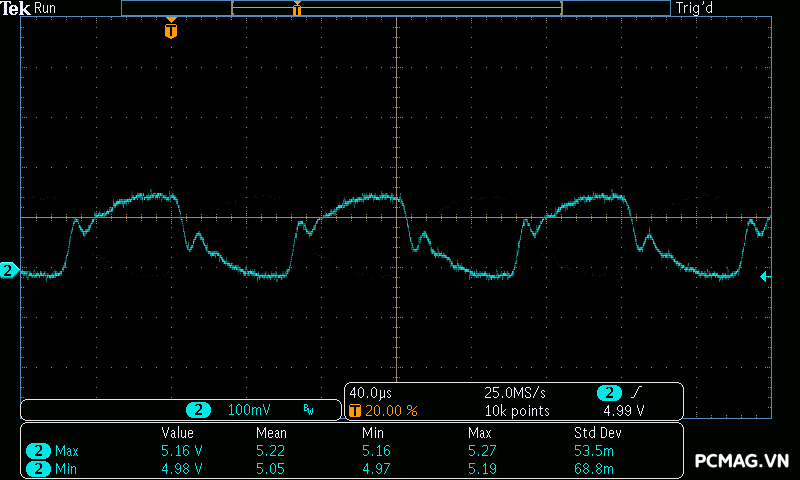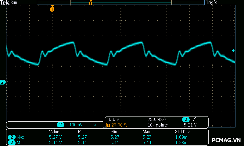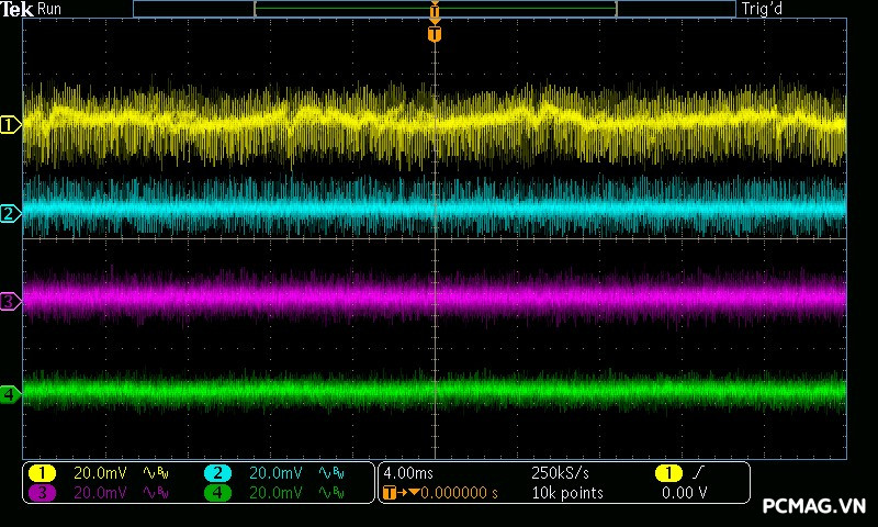 Trong bài kiểm tra Ripple & Noise, VSP Extreme TPS750 750W cho kết quả ở mức khá, với mức nhiễu trên các đường điện dao động khoảng dưới 65mV. Giá trị này vẫn nằm trong giới hạn cho phép của tiêu chuẩn ATX, đảm bảo nguồn điện cung cấp cho các linh kiện trong hệ thống được duy trì tương đối ổn định trong quá trình hoạt động.
