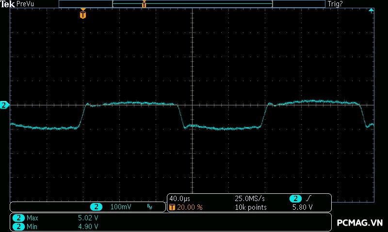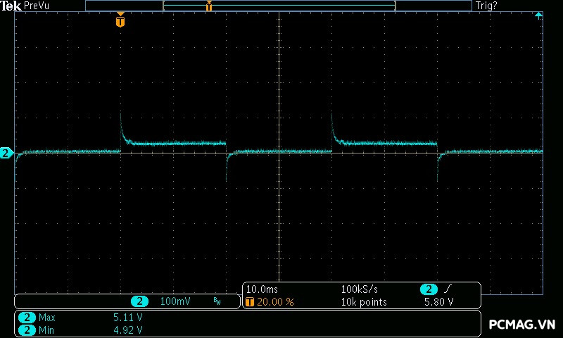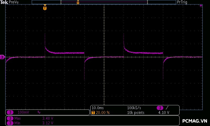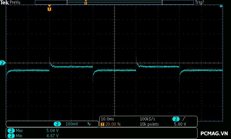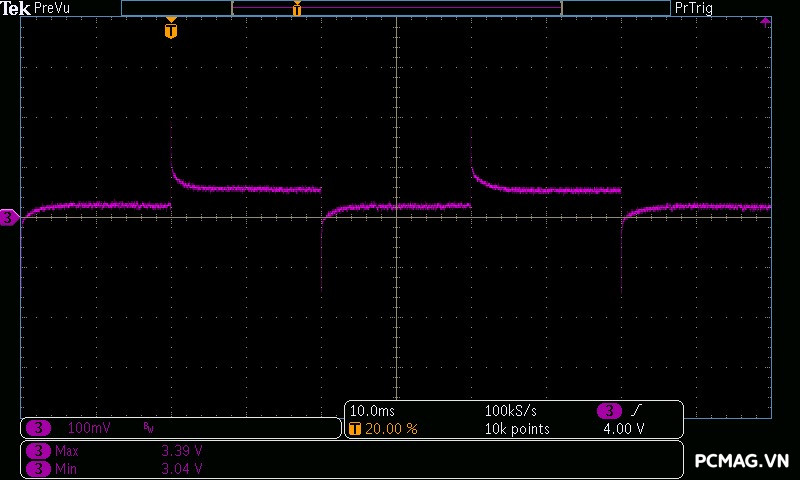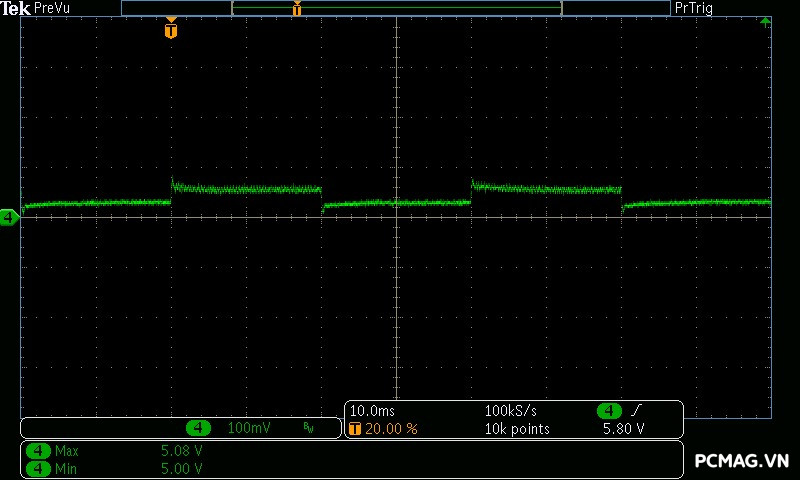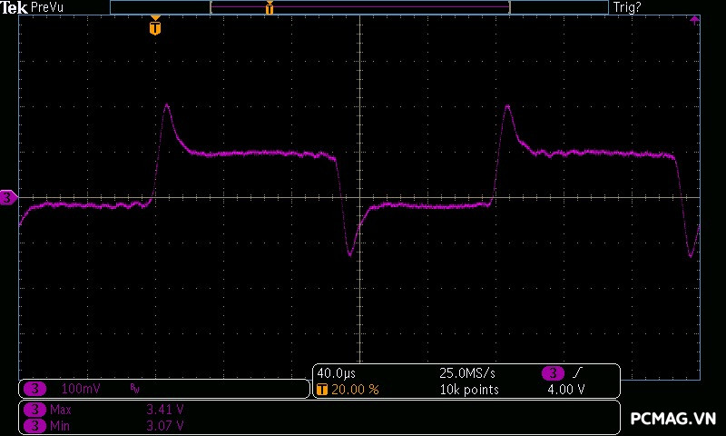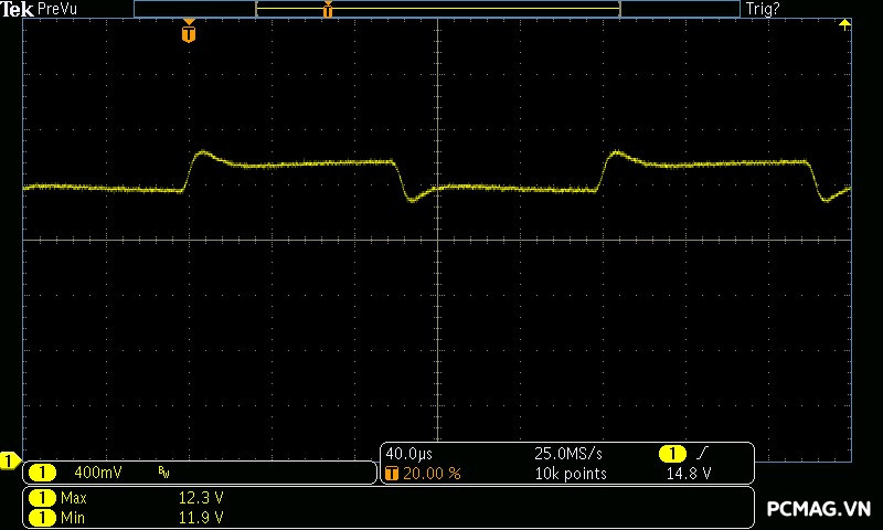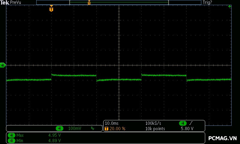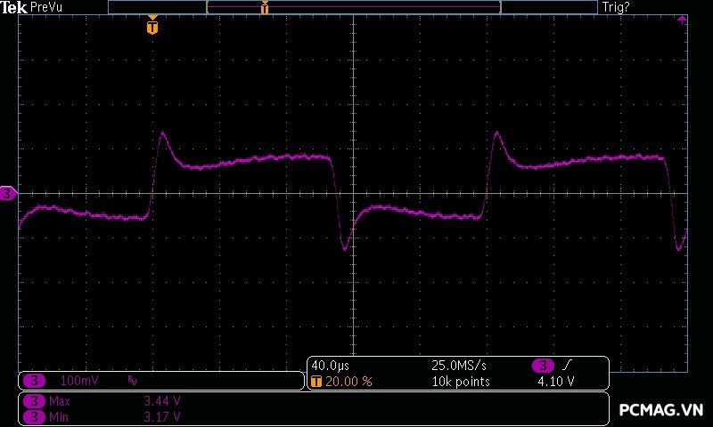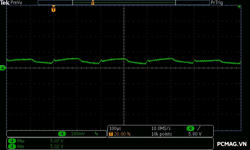 Trong bài kiểm tra này, GX850M có độ dao động điện áp ở mức khá, đảm bảo ổn định trên hầu hết các đường điện. Tuy nhiên, đường 3.3V có độ lệch khoảng 0.1V, vượt nhẹ khỏi tiêu chuẩn ATX — một điểm hơi đáng tiếc ở tổng thể kết quả.
