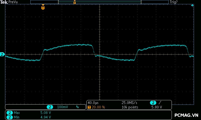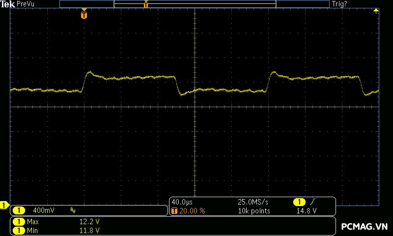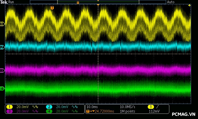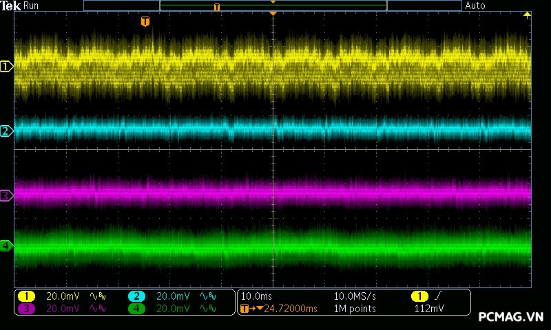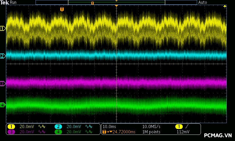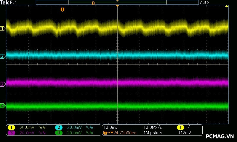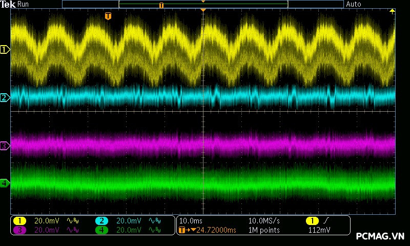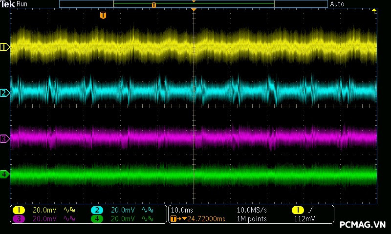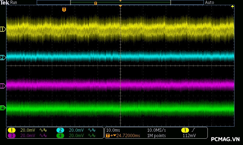 GX850M ghi nhận mức ripple noise ở ngưỡng trung bình, trong đó đường 12V đạt hơn 70mV ở mức tải nhẹ. Nguyên nhân là do IC điều khiển chuyển sang hoạt động ở vùng PWM với chế độ Burst Mode, nhằm tối ưu hóa hiệu suất khi tải thấp đến siêu thấp. Ở các đường điện còn lại, ripple duy trì ở mức tốt, chỉ khoảng 30mV, hoàn toàn nằm trong giới hạn cho phép của chuẩn ATX.