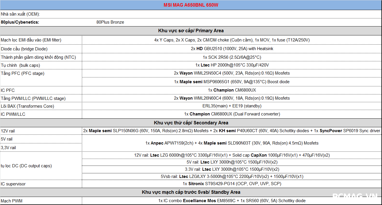 Bảng linh kiện được sử dụng trên MAG A650BNL: