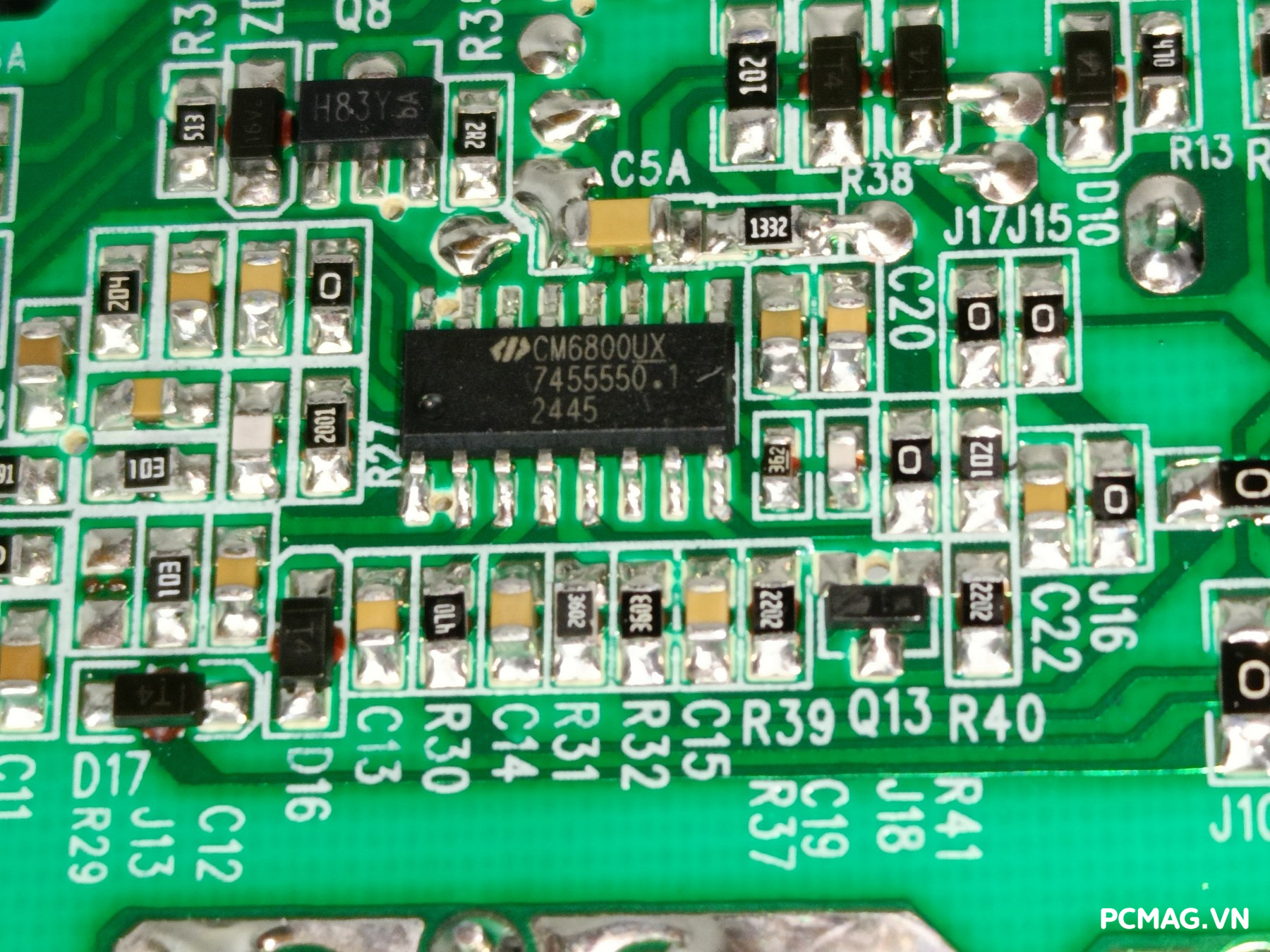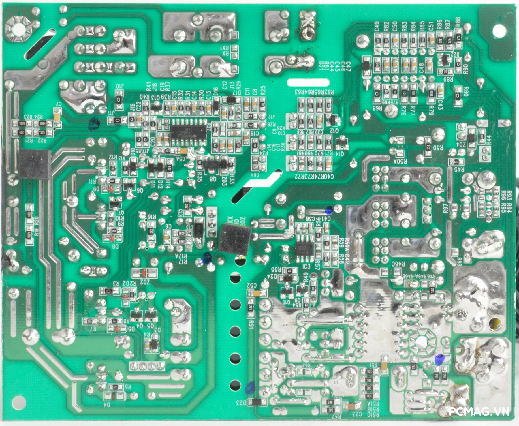 Các tụ rắn và tụ hóa lọc ngõ ra trên MSI MAG A650BNL được cung cấp bởi CapXon và Ltec, đều có nhiệt độ hoạt động tối đa 105°C, đáp ứng yêu cầu vận hành lâu dài. Phần mạch in PCB của bộ nguồn có bề mặt sạch và bóng, tuân thủ tiêu chuẩn RoHS, dù vẫn còn một vài vết flux chưa được làm sạch hoàn toàn trong quá trình sản xuất.