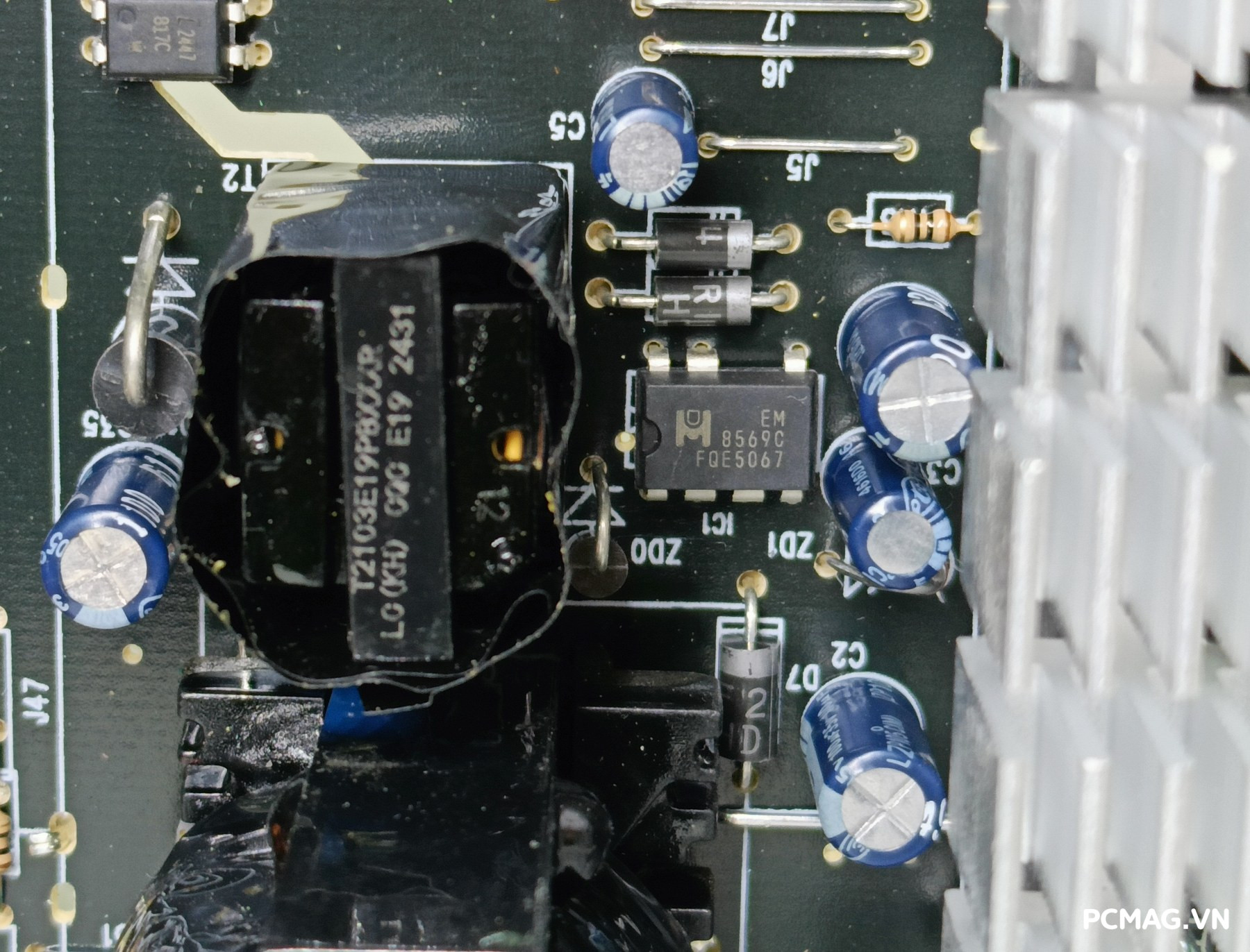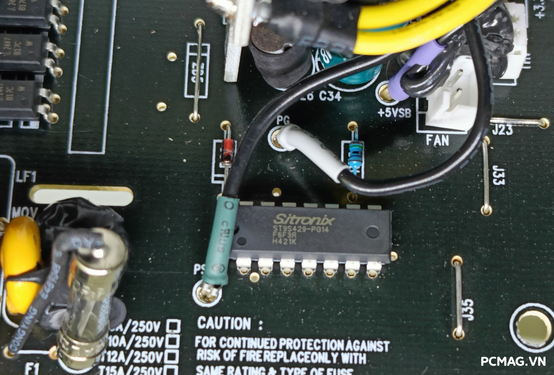 IC giám sát trên MSI MAG A650BNL là Sitronix ST9S429-PG14, đảm nhiệm việc theo dõi và bảo vệ hệ thống với 4 cơ chế an toàn cơ bản gồm OCP, SCP, OVP và UVP. Bên cạnh đó, đường cấp trước 5VSB được tạo ra bởi IC combo Excelliance MOS EM8569C, đảm bảo nguồn chờ hoạt động ổn định cho các chức năng nền của hệ thống.