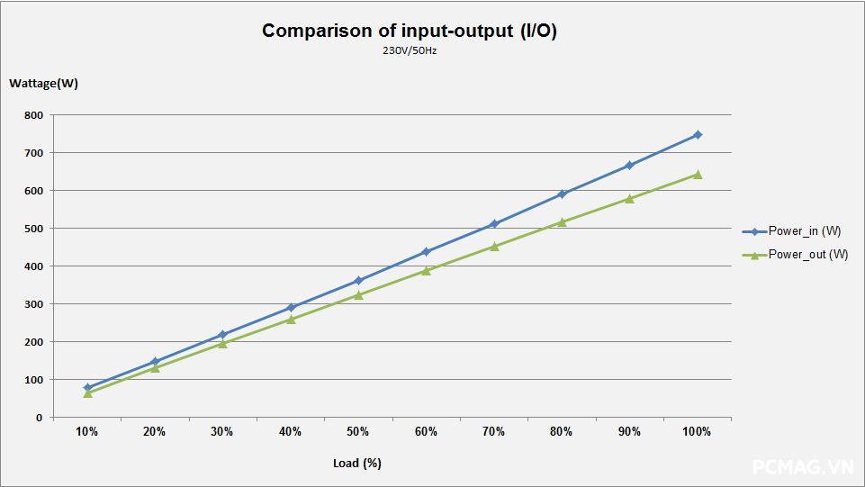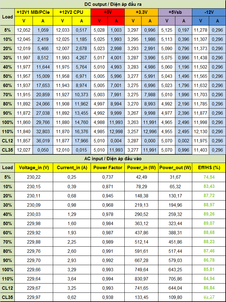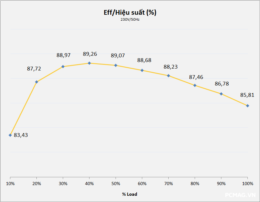 Trong quá trình thử nghiệm, MSI MAG A650BNL cho thấy khả năng vận hành ổn định, hoàn thành tốt các mức tải với độ dao động điện áp thấp, luôn nằm trong giới hạn tiêu chuẩn ATX. Hiệu suất hoạt động cao nhất đạt 89.26% tại điện áp 230Vac, phù hợp với chứng nhận 80Plus Bronze.