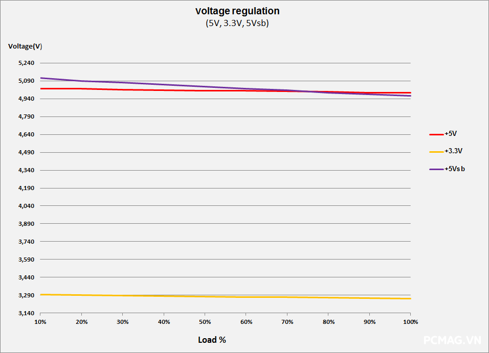 Nhờ được trang bị thiết kế DC to DC, các đường điện 12V, 5V và 3.3V đều đáp ứng tốt yêu cầu ngay cả trong các bài kiểm tra tải không đồng đều (Cross Load – CL).