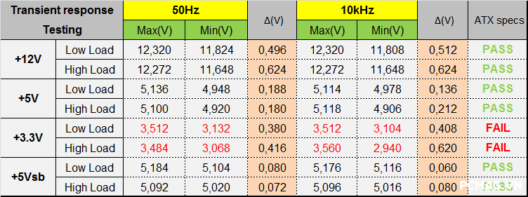 Điều kiện thử nghiệm được thiết lập theo chuẩn Intel ATX 3.0, với tải điện dung 3300µF trên mỗi rail gồm 12V1, 12V2, 5V, 3.3V và 5VSB. Tốc độ thay đổi dòng (slew rate) lần lượt là 5A/µs đối với 12V (12VHPWR) hoặc 2.5A/µs, 1A/µs cho 5V và 3.3V, và 0.1A cho 5VSB.