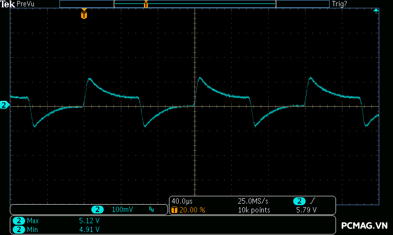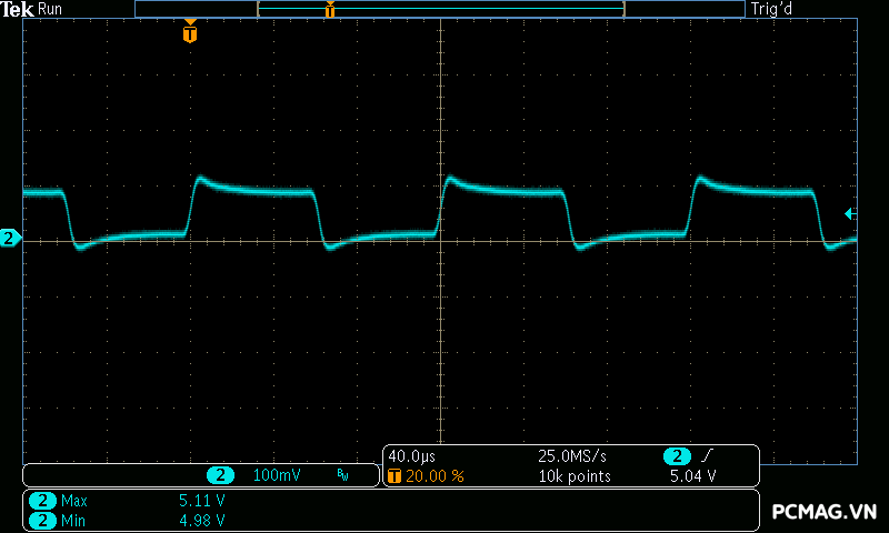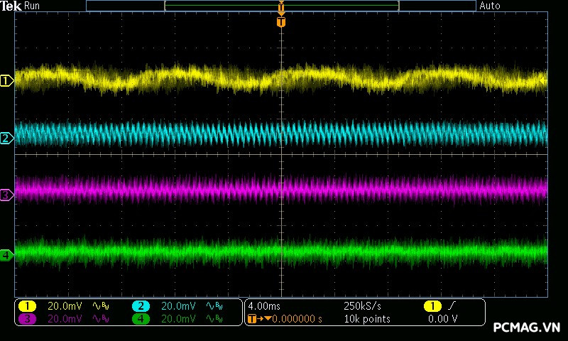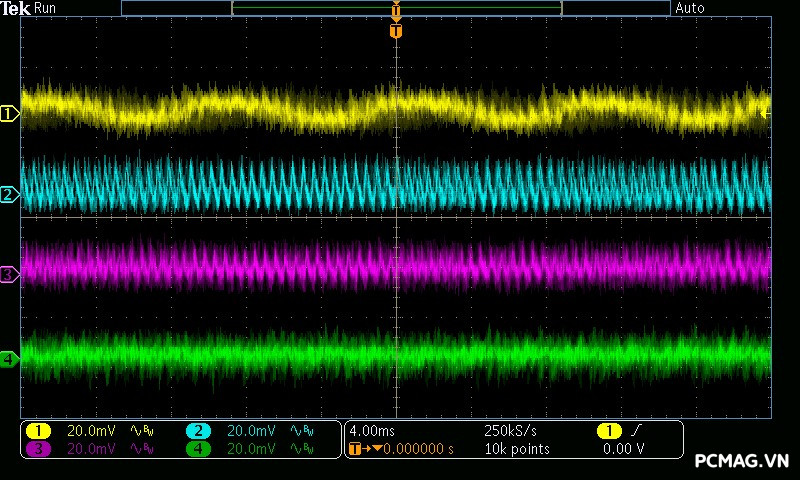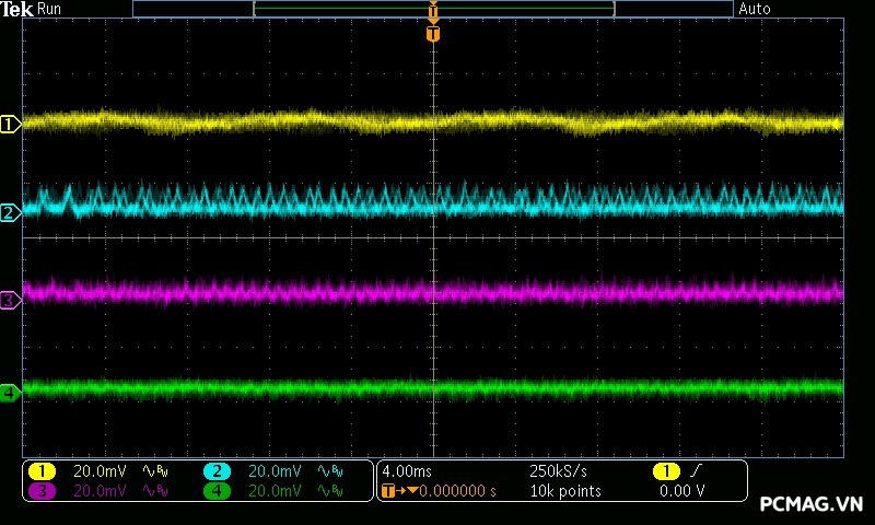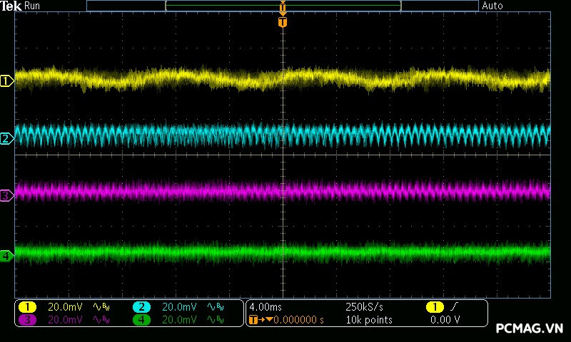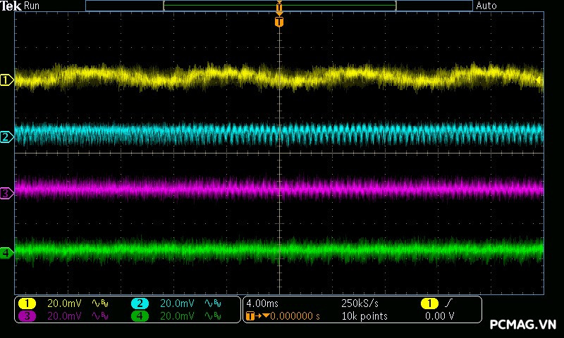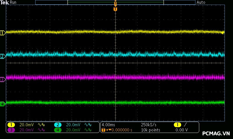 Trong bài kiểm tra ripple và noise, MSI MAG A650BNL cho kết quả ở mức tốt, với biên độ nhiễu trên tất cả các đường điện đều dao động quanh ngưỡng dưới 25mV. Mức thể hiện này cho thấy khả năng lọc nhiễu ổn định, đồng thời khá tương đồng với kết quả của mẫu MAG A550BN đã từng được thử nghiệm trước đó.